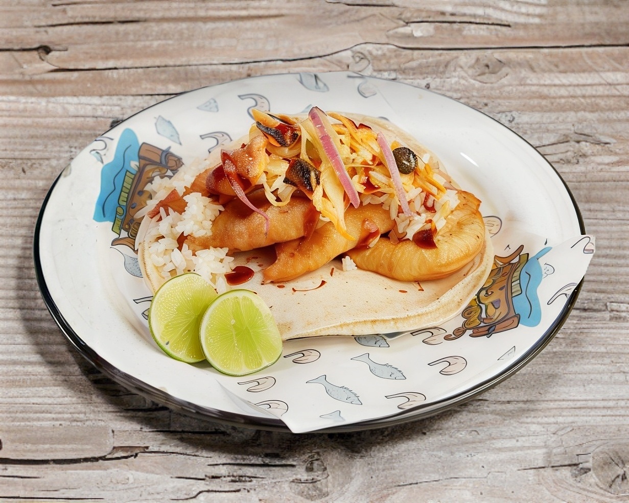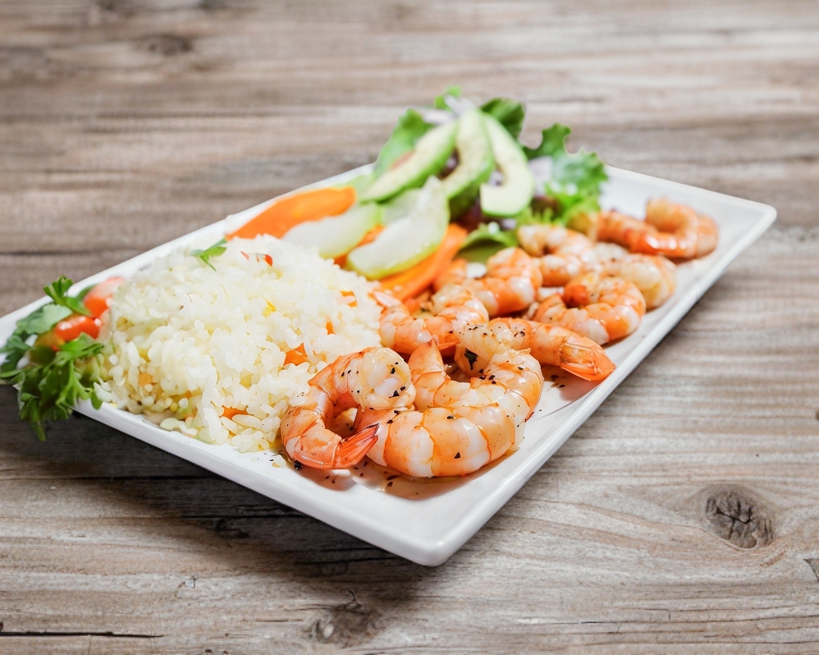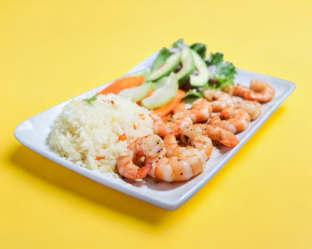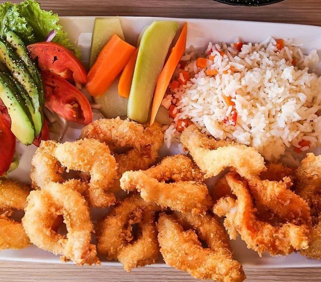 220 gr. de camarones empanizados acompañados de una porción de arroz y verduras.