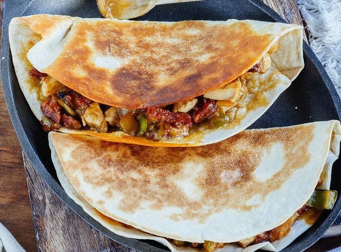 Sabrosa quesadilla en tortilla dre harina doblada con chorizo y queso