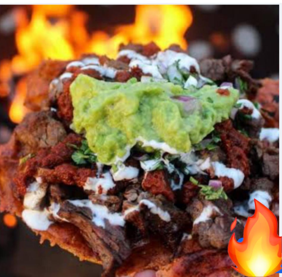 Carne de tu preferencia, cebolla, cilantro, frijoles de la olla, y una capa de 🧀 asadero gratinado 🤤, todo lo anterior sobre una tostadita, acompañado de cebolla guisada, salsa verde y salsa roja va aparte.