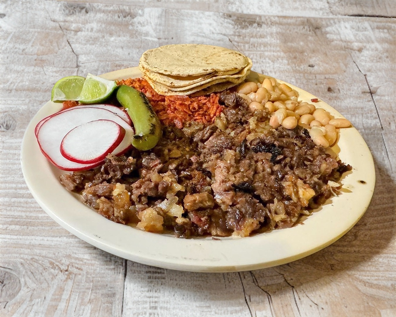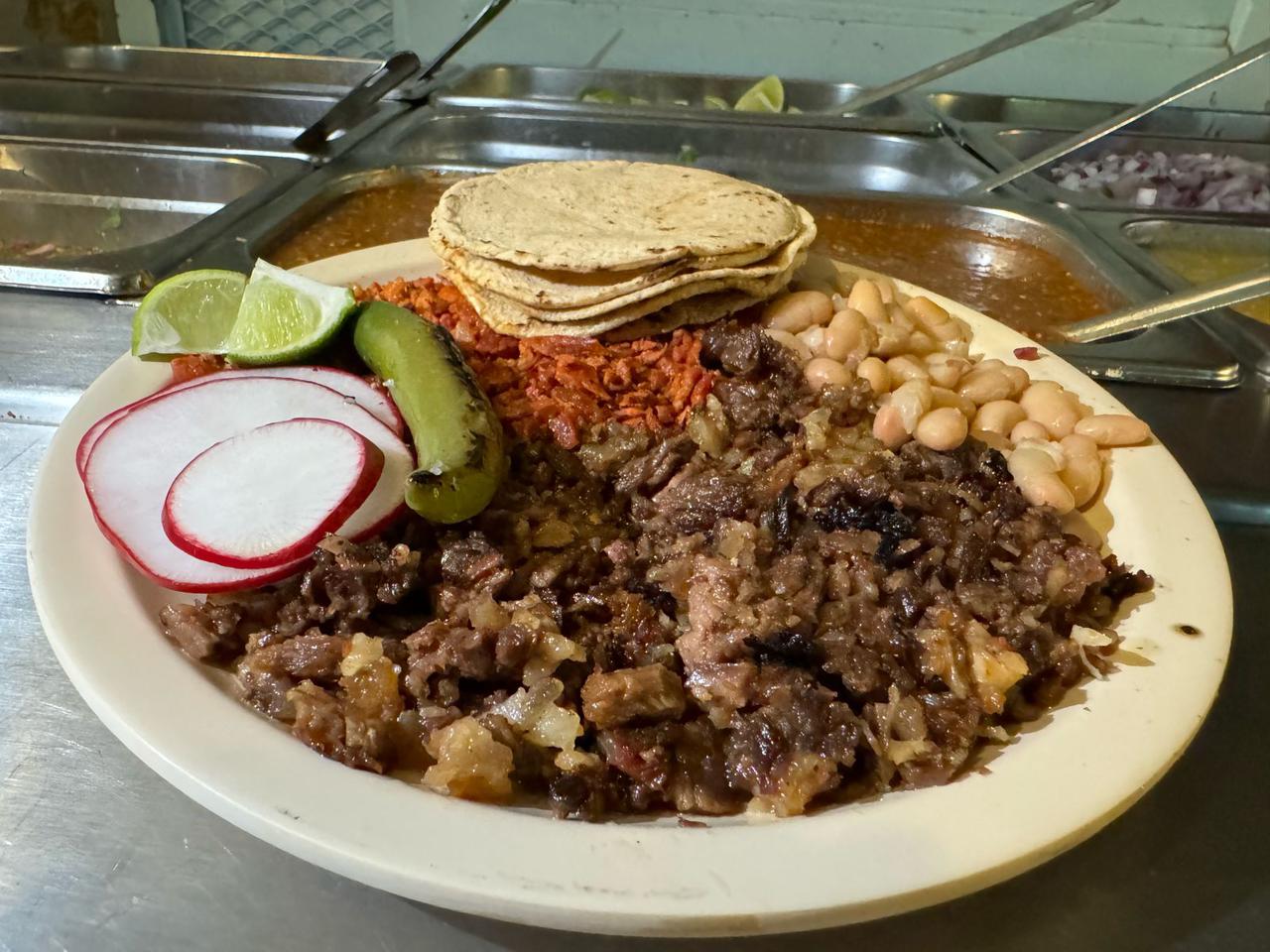 Elige tu carne favorita, acompañada de frijoles, tortillas, cebolla,cilantro, salsa verde y salsa roja