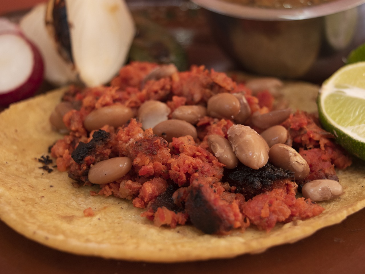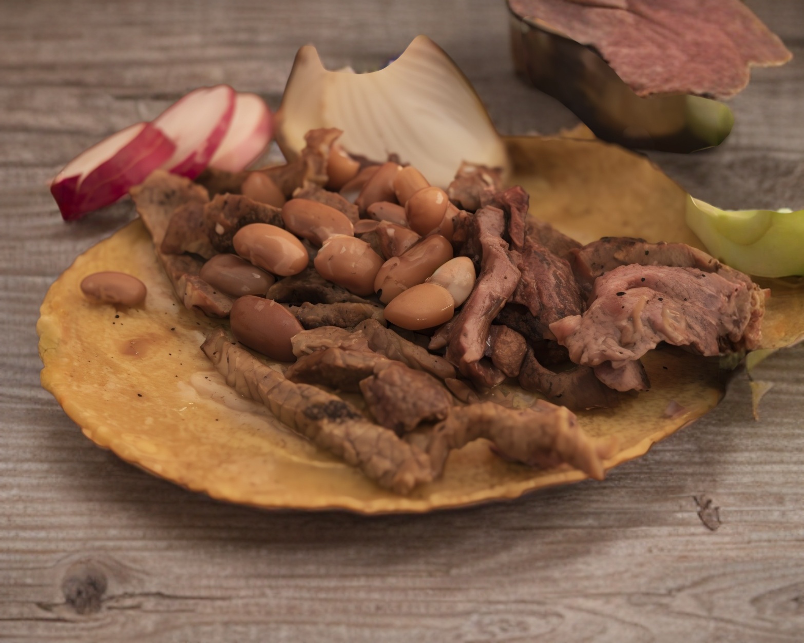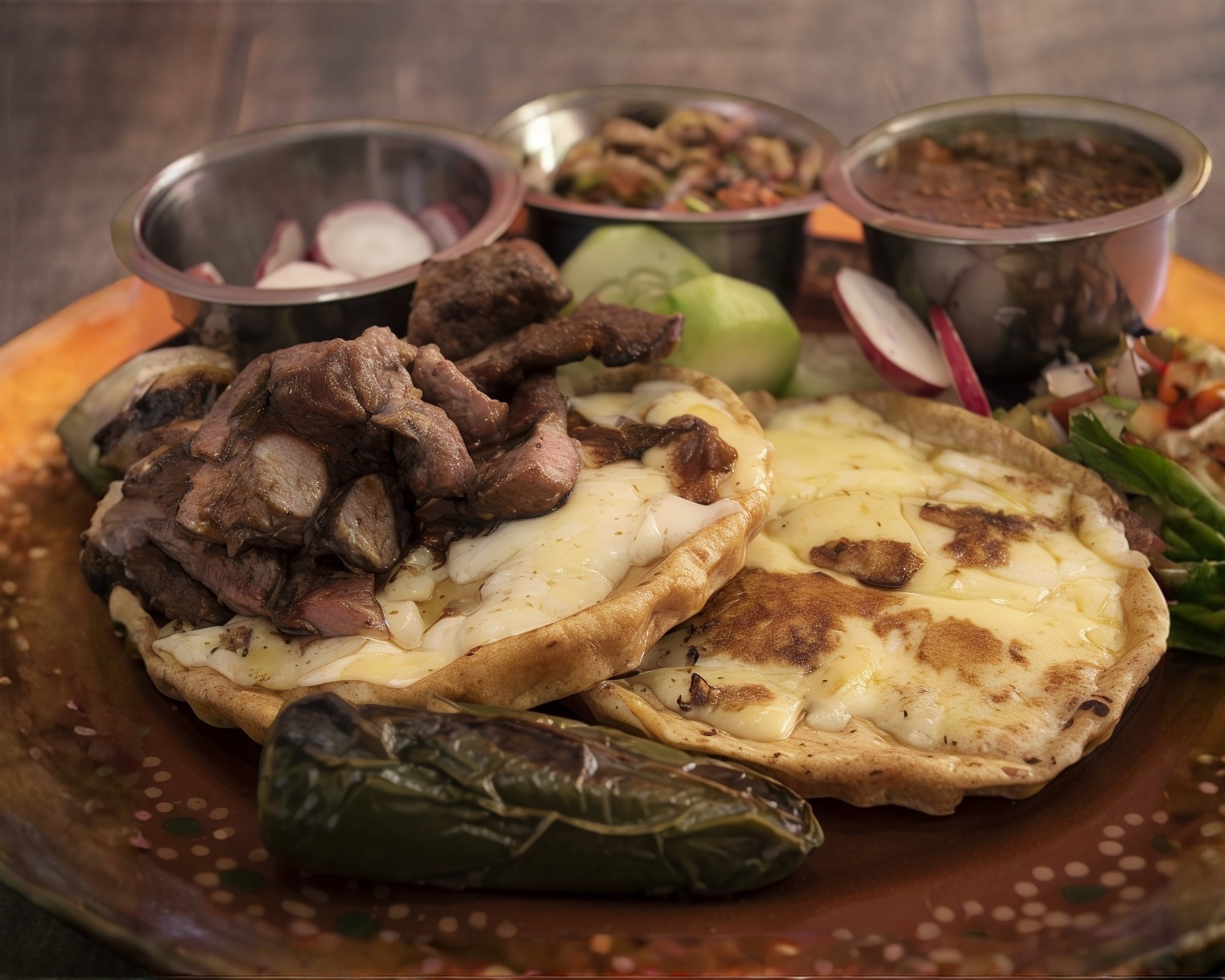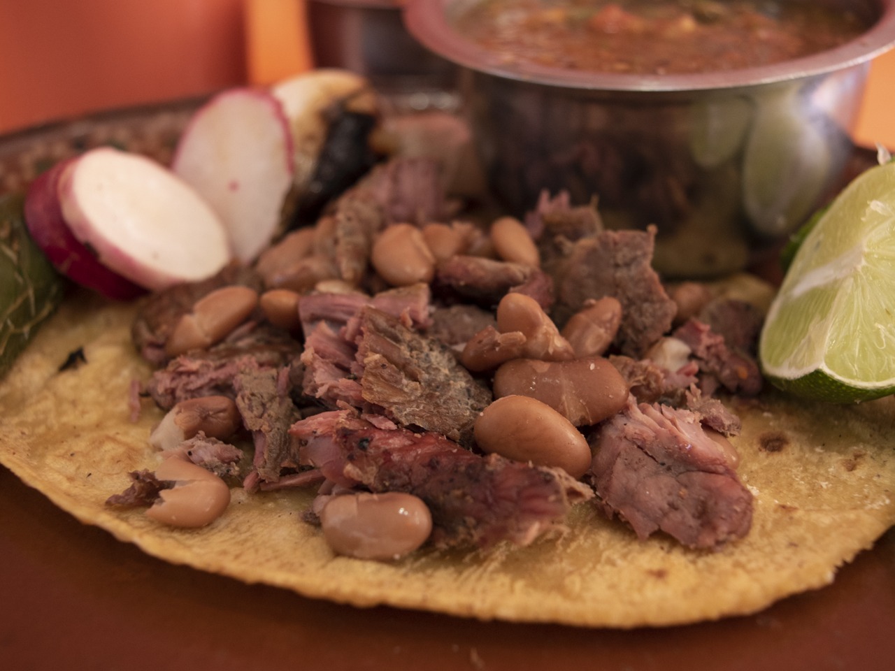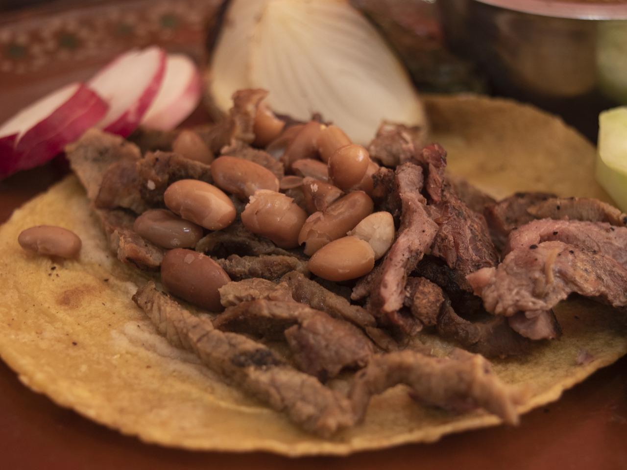 Tortilla grande harina, queso, carne, frijoles guisados.