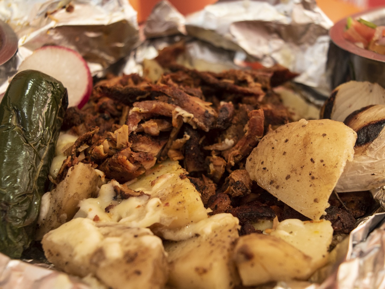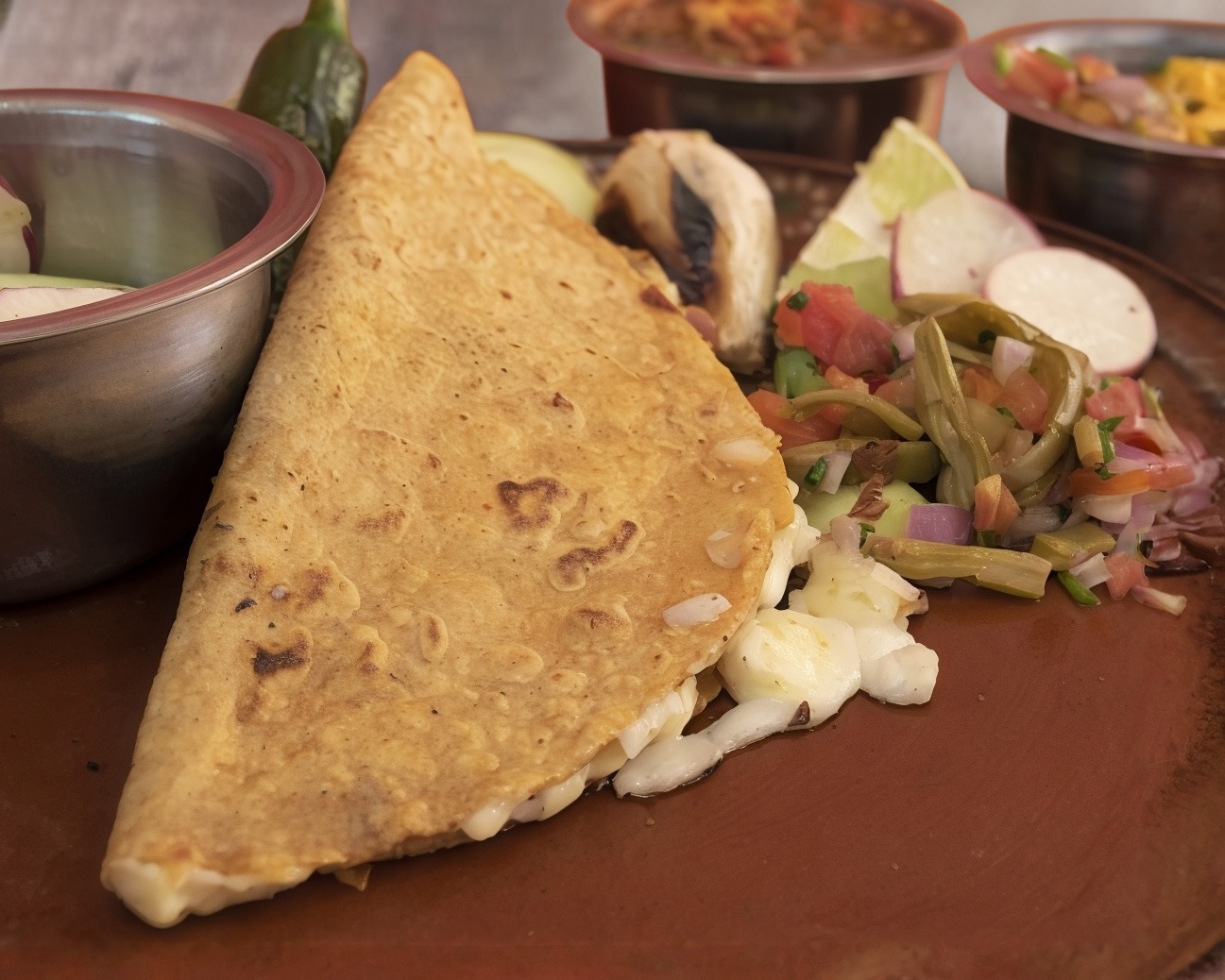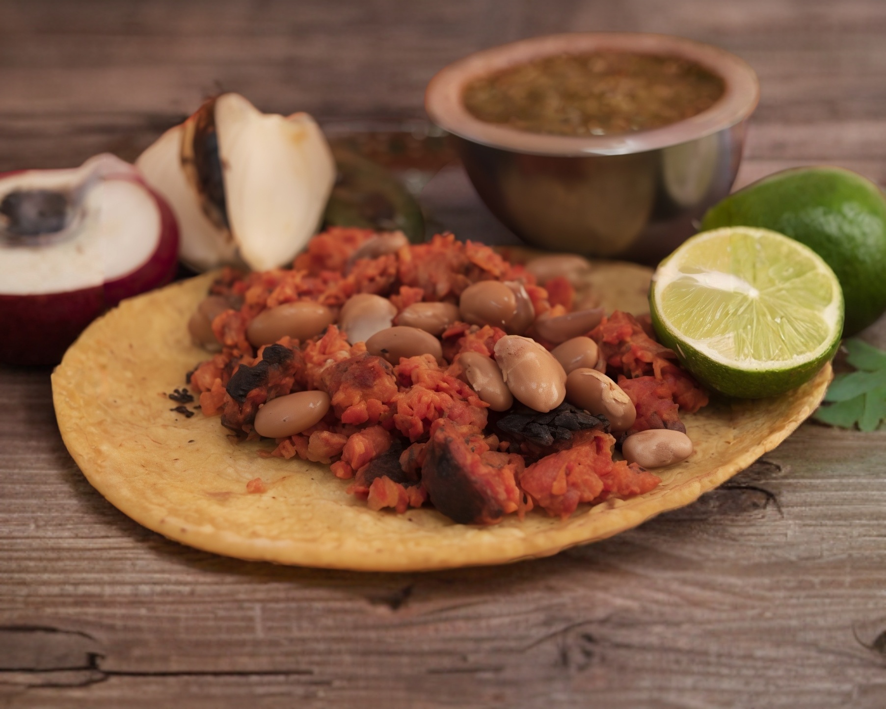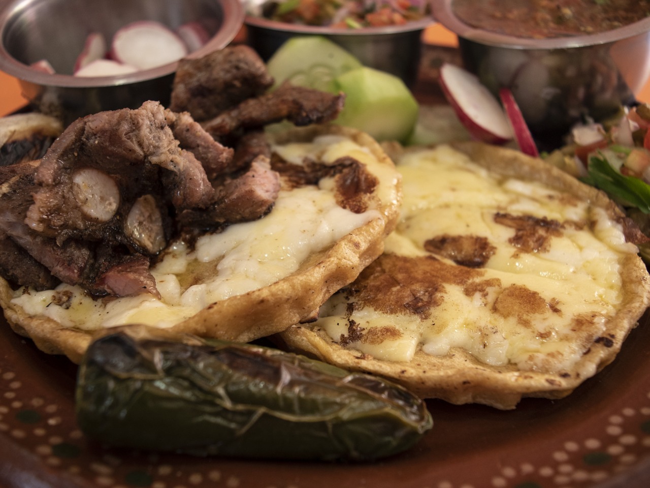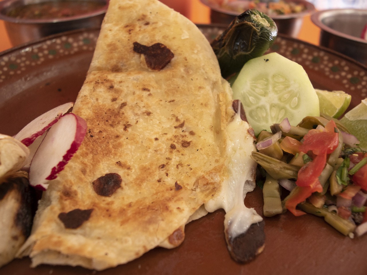Tortilla grande harina, queso, carne, frijoles guisados.