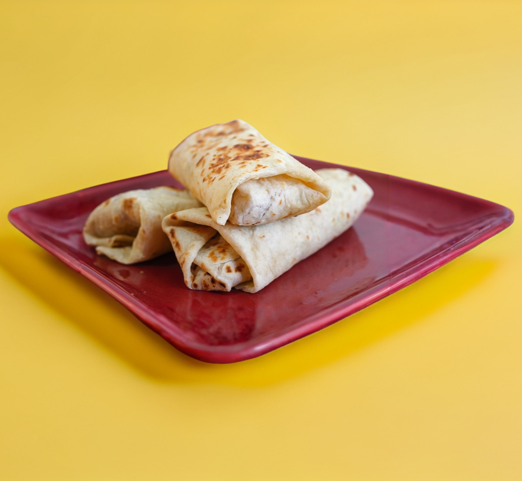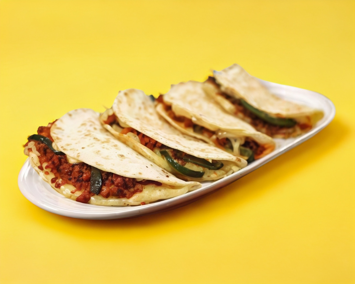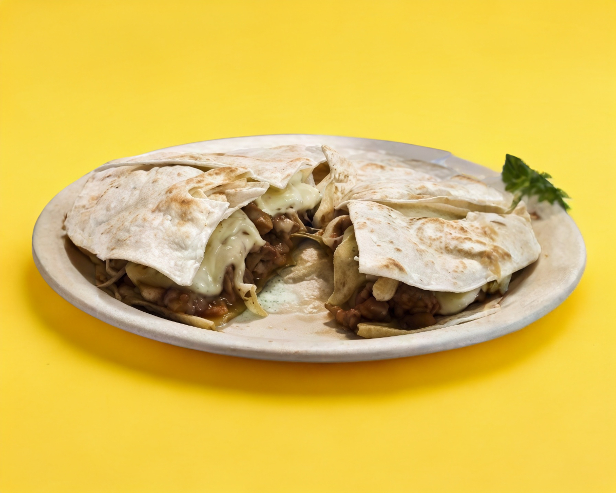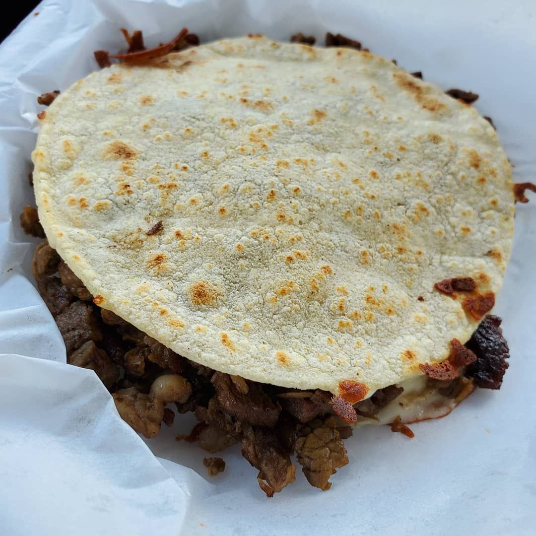 2 Tortillas de harina empalmadas, con queso asadero y carne.