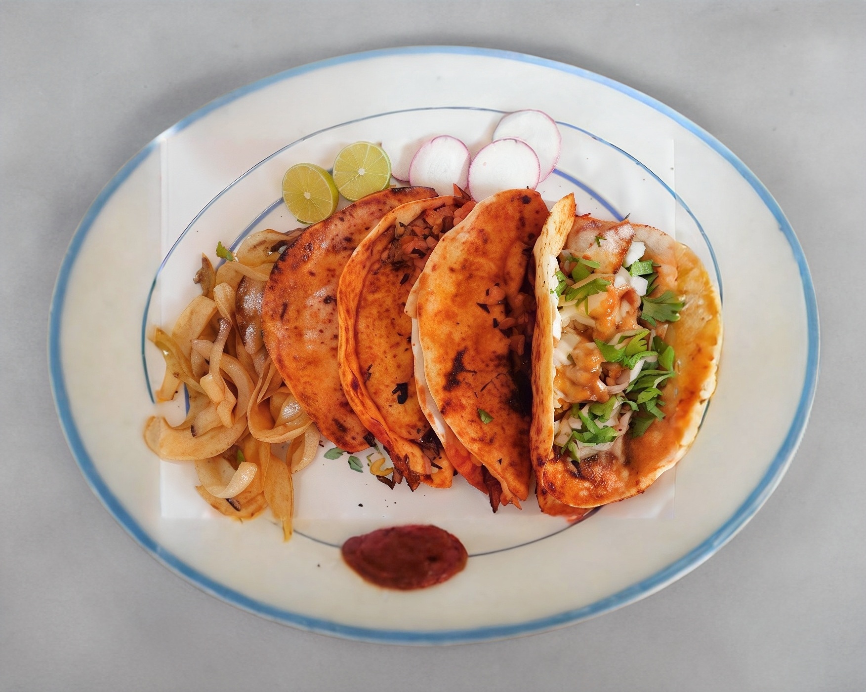 Doble tortilla de maíz con barbacoa cebolla cilantro y limón