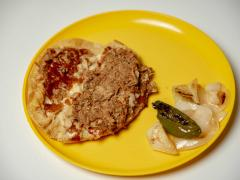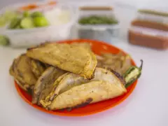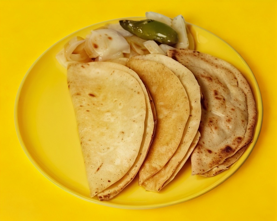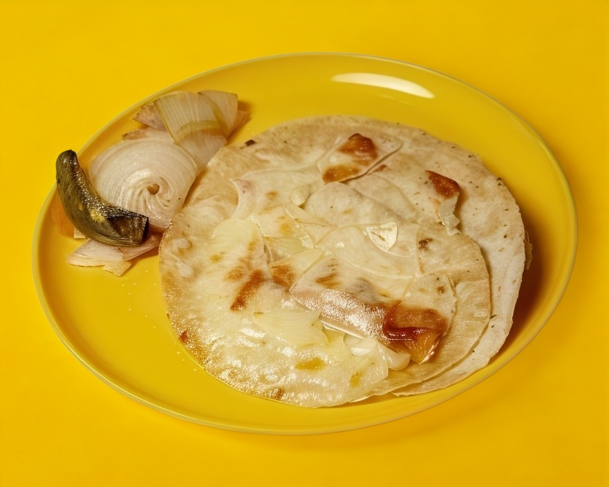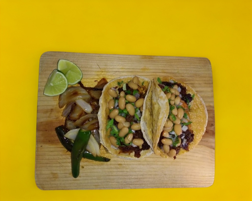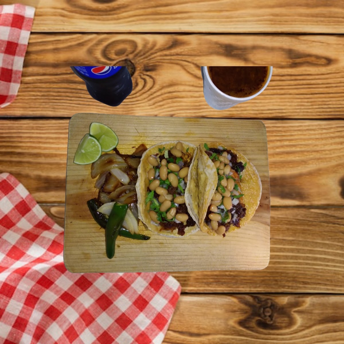 Doble tortilla de maíz blandita con deliciosa barbacoa tatemada y exquisito queso fundido cebolla, cilantro, chile de tomate, frijolitos de la olla, su cebollita guisada y chilito guisado.