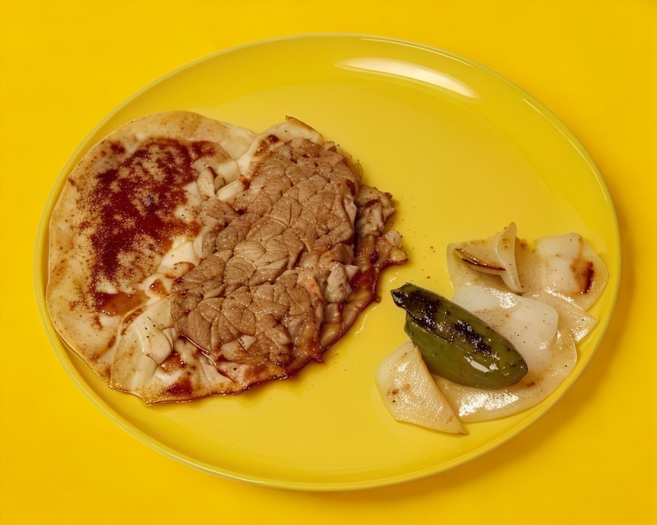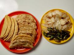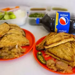 Doble tortilla, la barbacoa va doradita y queso fundido arriba, cebollita asada, chile toreado y sus guarniciones.