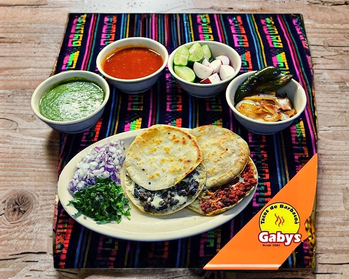 Mestiza de barbacoa de res, dos tortillas empalmadas y al centro queso con barbacoa, acompañado de salsa y verdura por aparte.