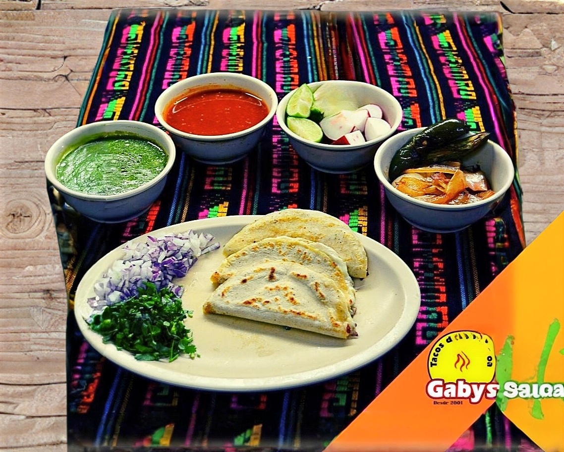 Unidad de mestiza de chorizo, dos tortillas empalmadas y al centro queso y chorizo, acompañado de salsa y verdura, por aparte cebolla y cilantro.