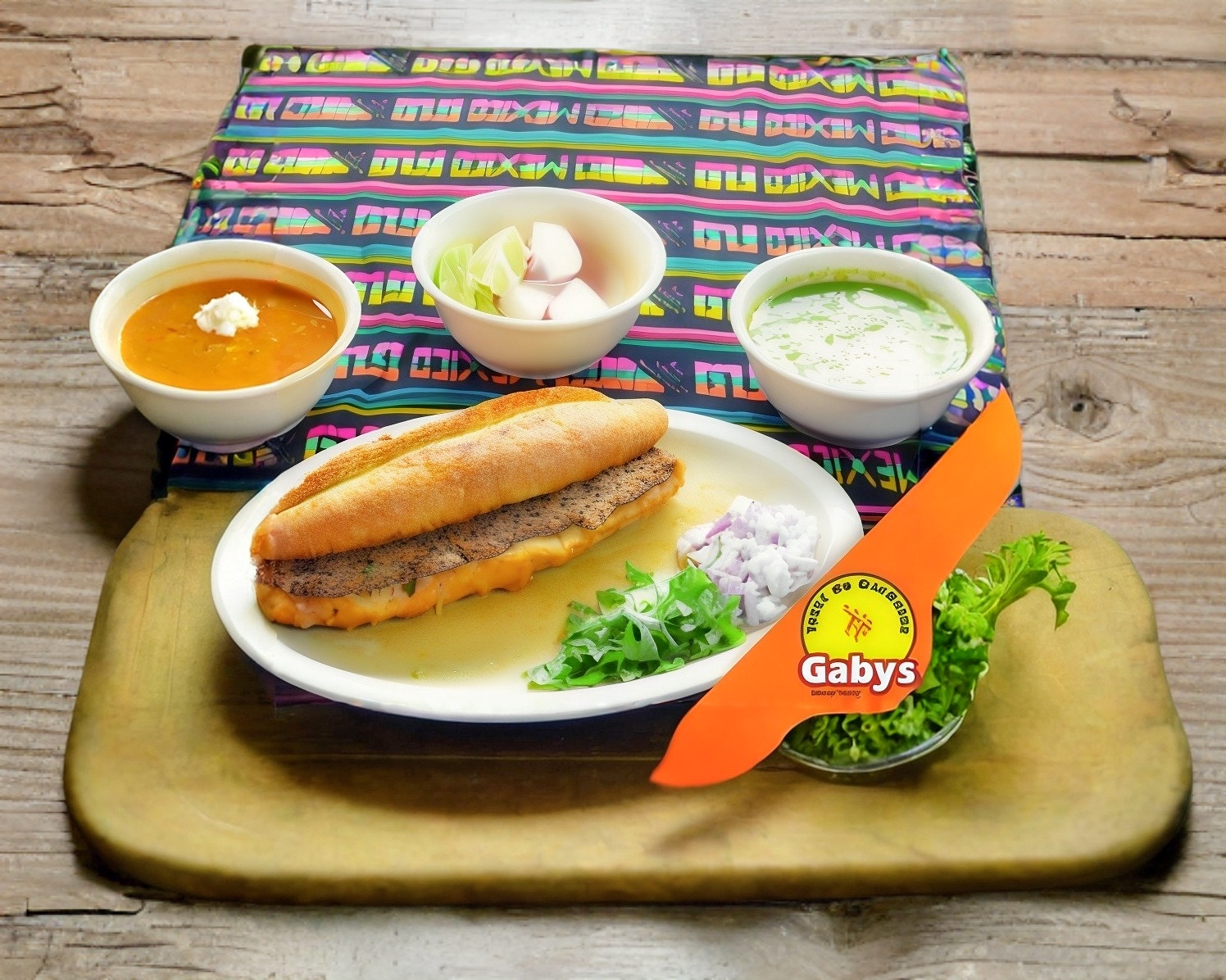 Lonche de barbacoa con bistec de res, acompañado por salsa y verdura por aparte.