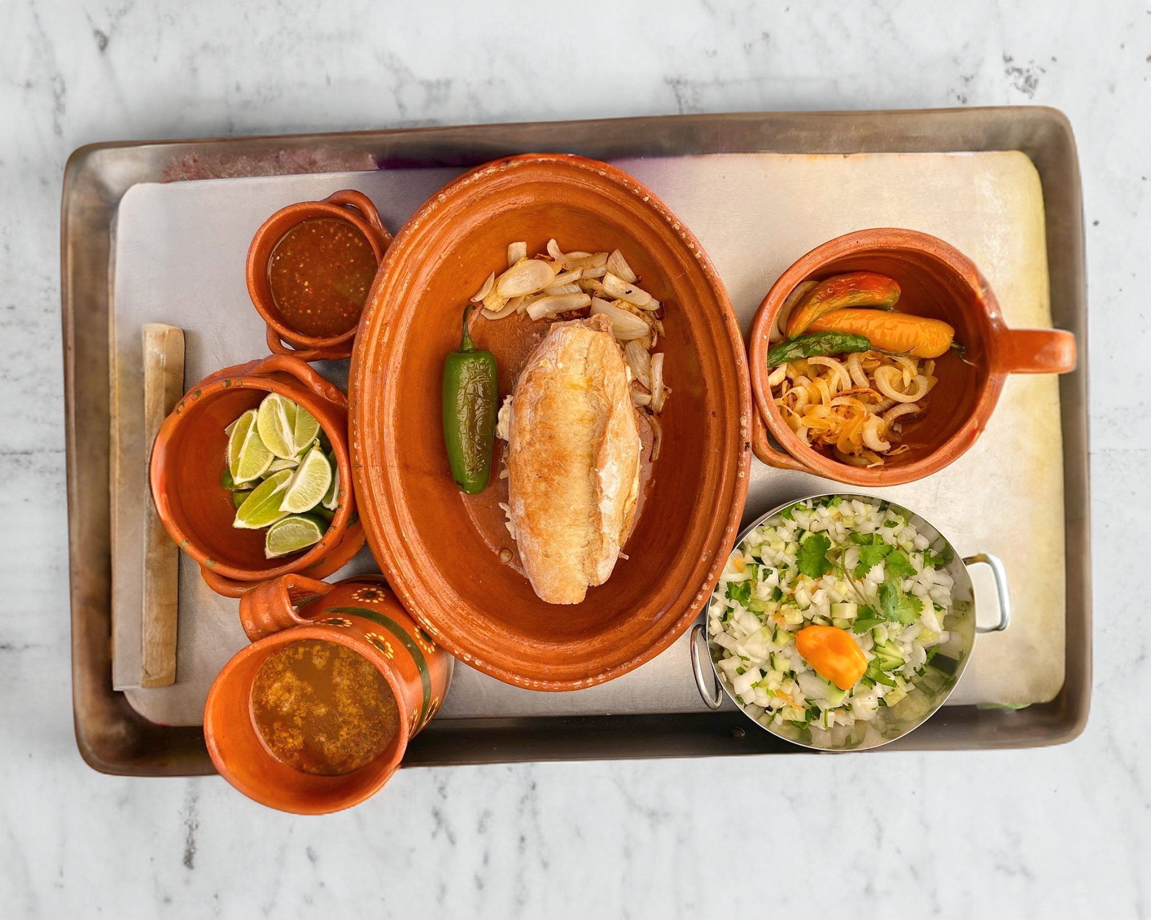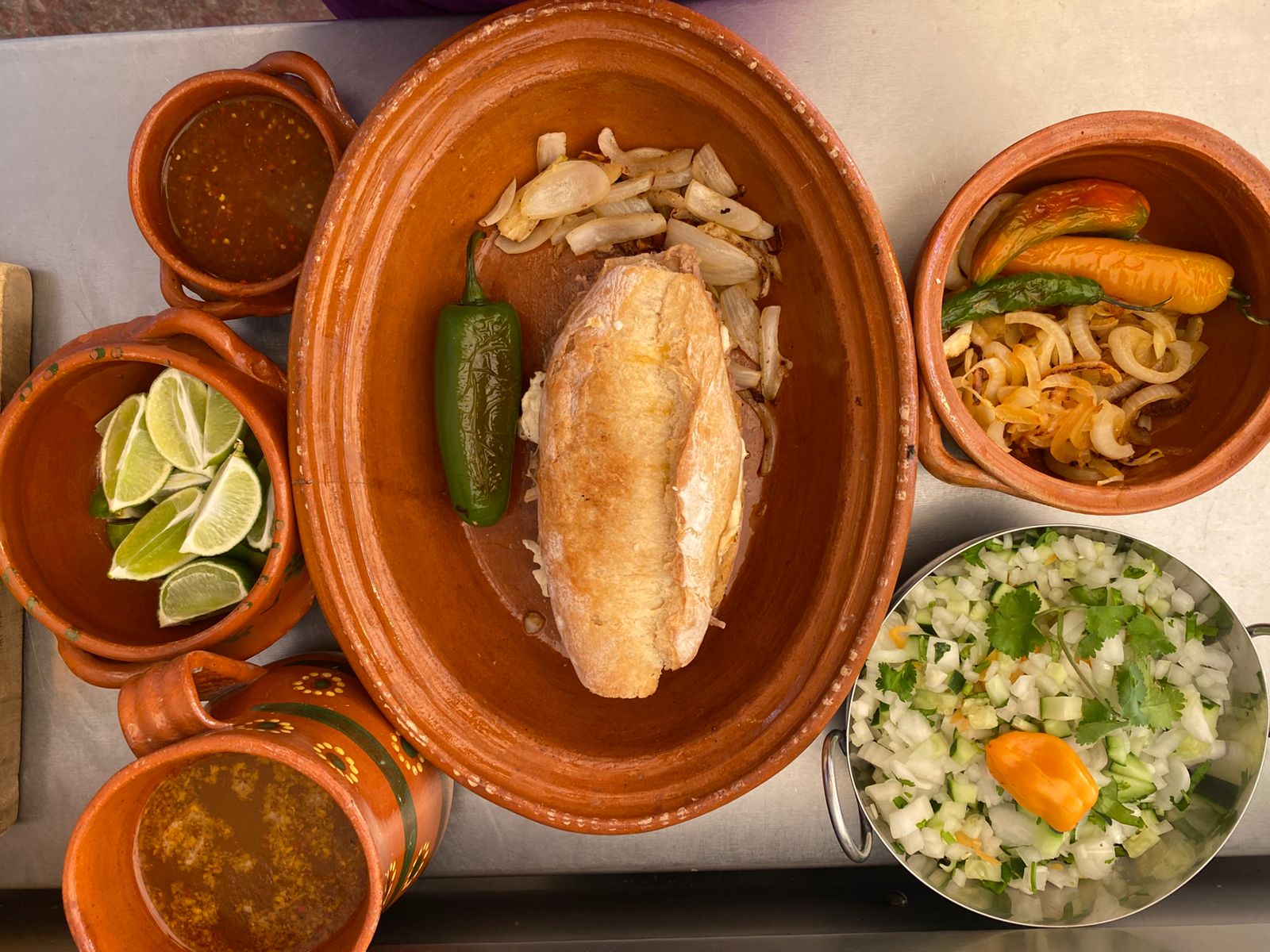 Pan birote acompañado con barbacoa. Verdura aparte.