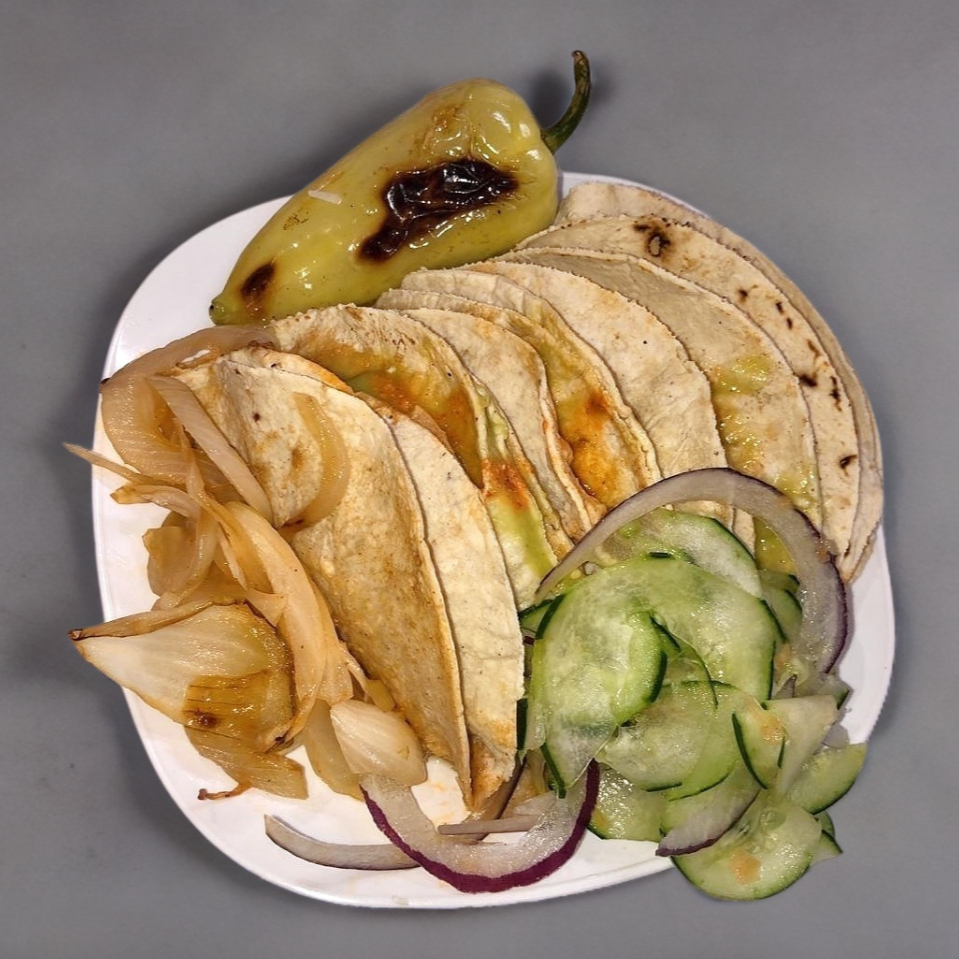 Acompañados con salsa, cebollita asada, y chiles.