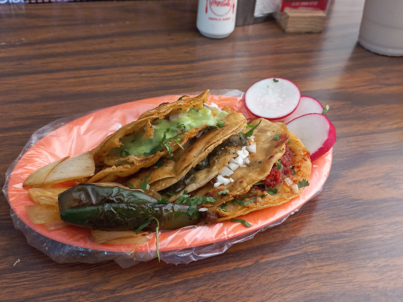 4 Tacos a base de harina de maiz Dorado de Barbacoa ( carne de carbacoa, salsa roja y verde guacacomole cebolla limon )+ 1 medio litro de Agua de sabor( el sabor lo escoges tu) + Consomé 1/4 ( segun disponibilidad)