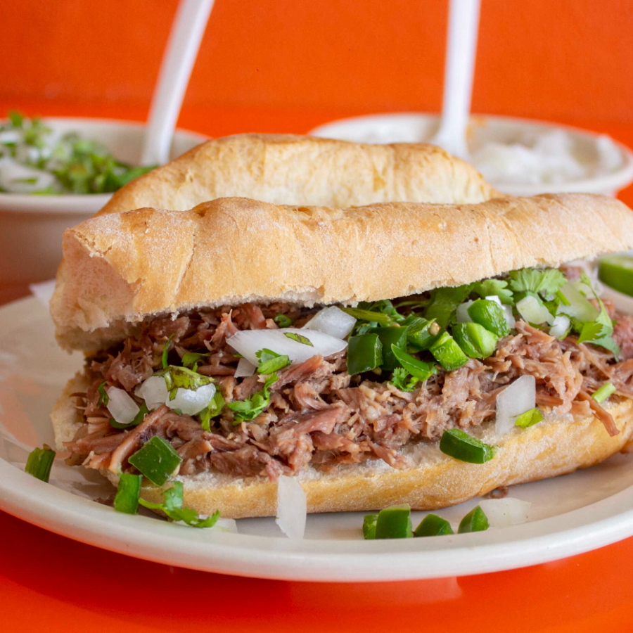 4 Tacos de barbacoa, bistek, chorizo y adobada y bebida chica, agua fresca o refresco, salsas, cebolla, cilantro, cebolla guisada y rábanos.