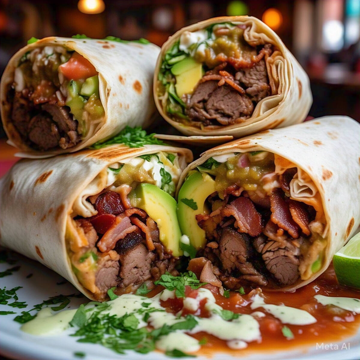 BURRITO BISTEC, TOCINO, JITOMATE, CEBOLLA Y AGUACATE. (BURRITO DE 24 CM)