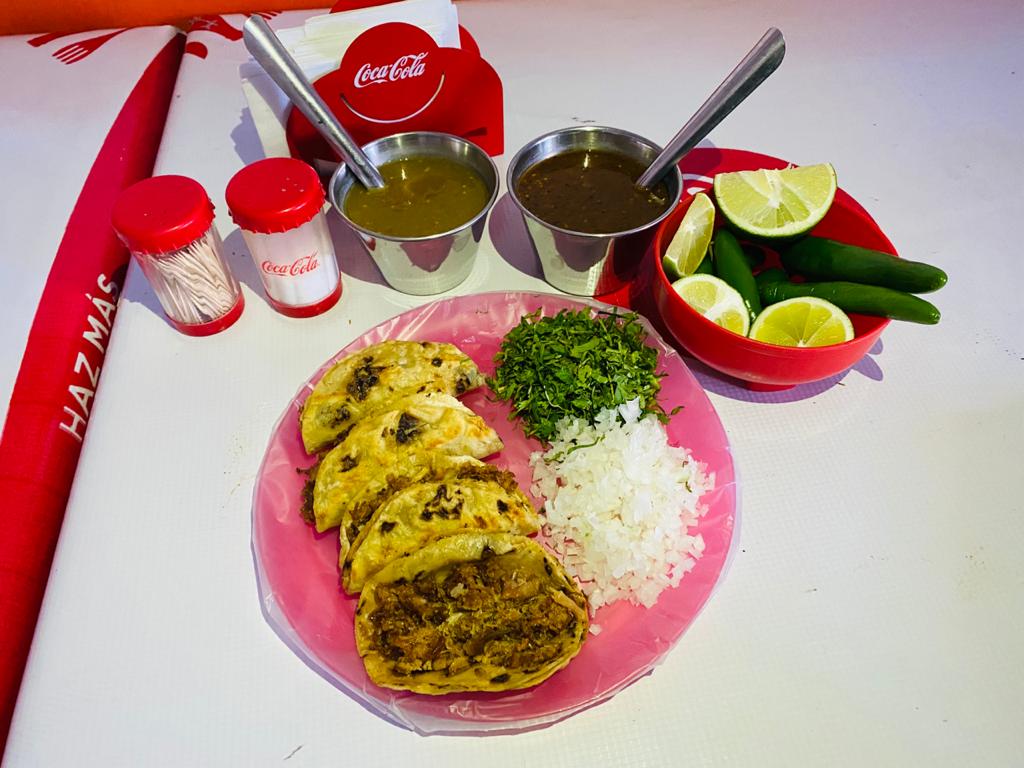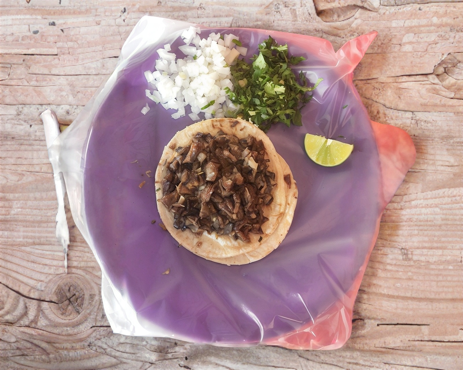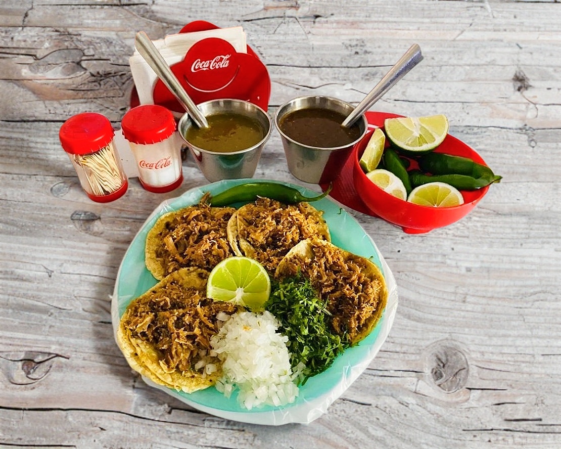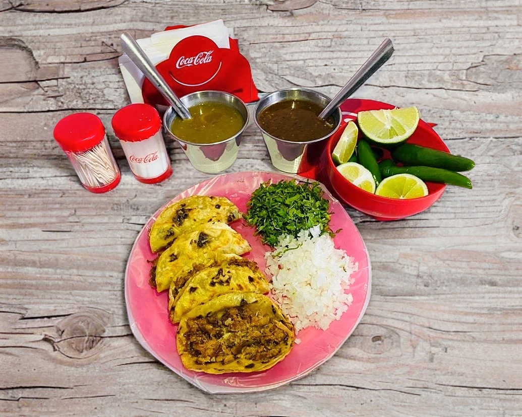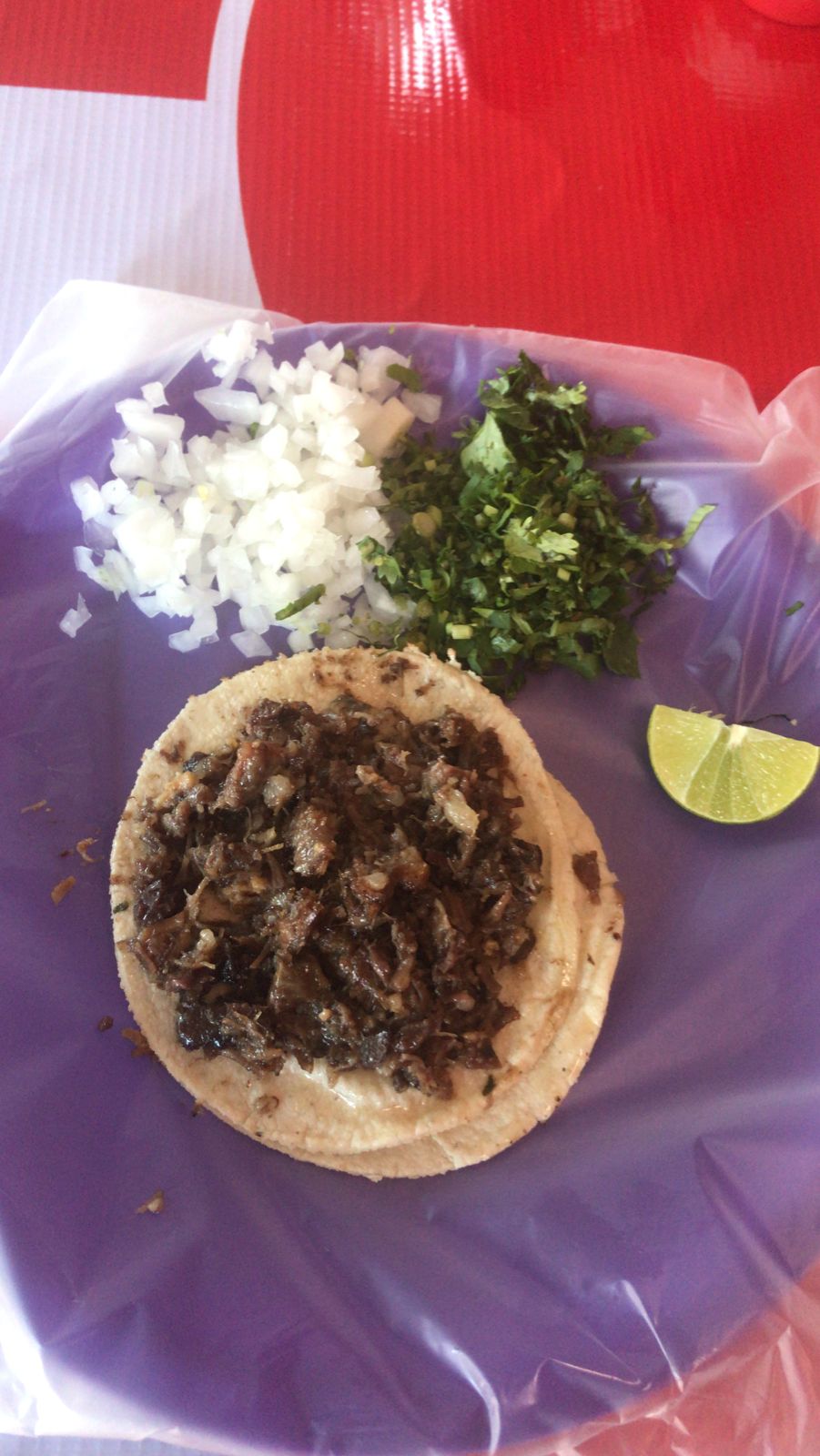 Tortilla de maiz, 50gr de Queso Oaxaca, 30gr de Carne, salsas, cebolla y cilantro