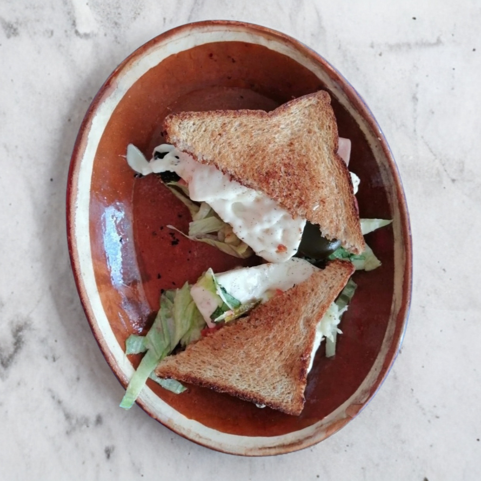 Bolillo fleima bien doradito ,con crema ,y pierna adobada,más verduras y aderezo
