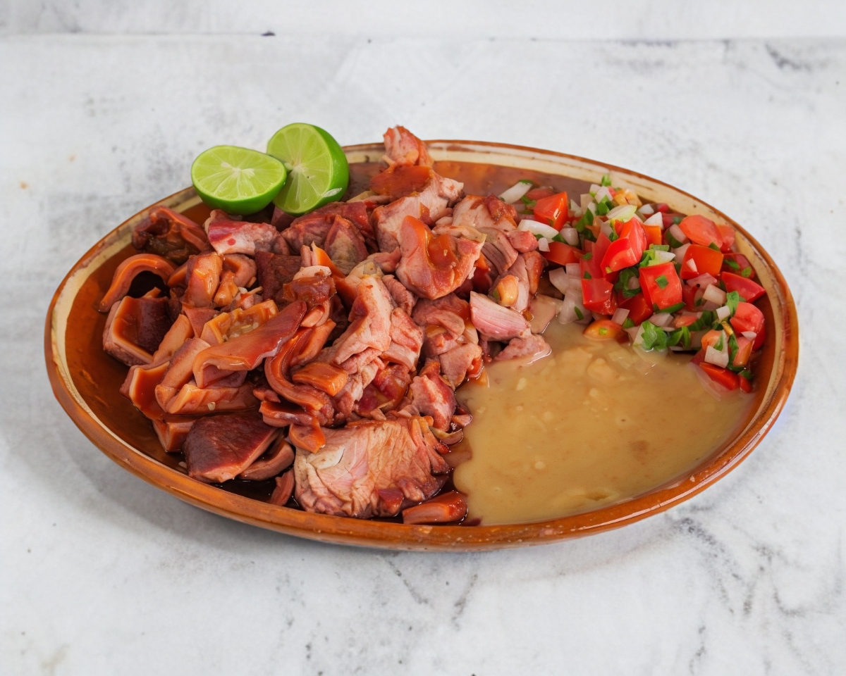Aprox. 250 g de carnitas deliciosas para que prepares tus tacos, acompañadas de frijoles fritos, salsa mexicana, chile martajado y tortillas.