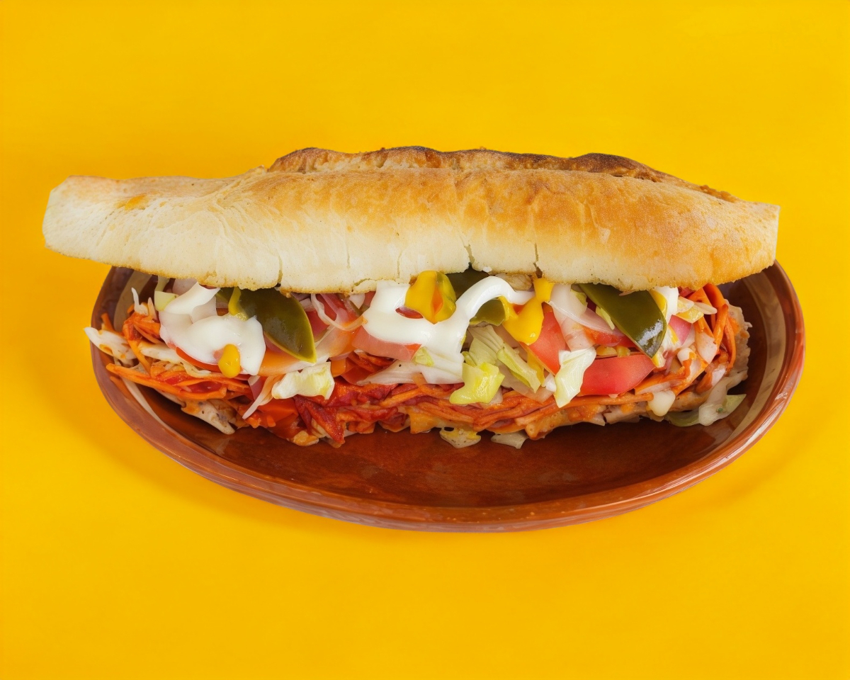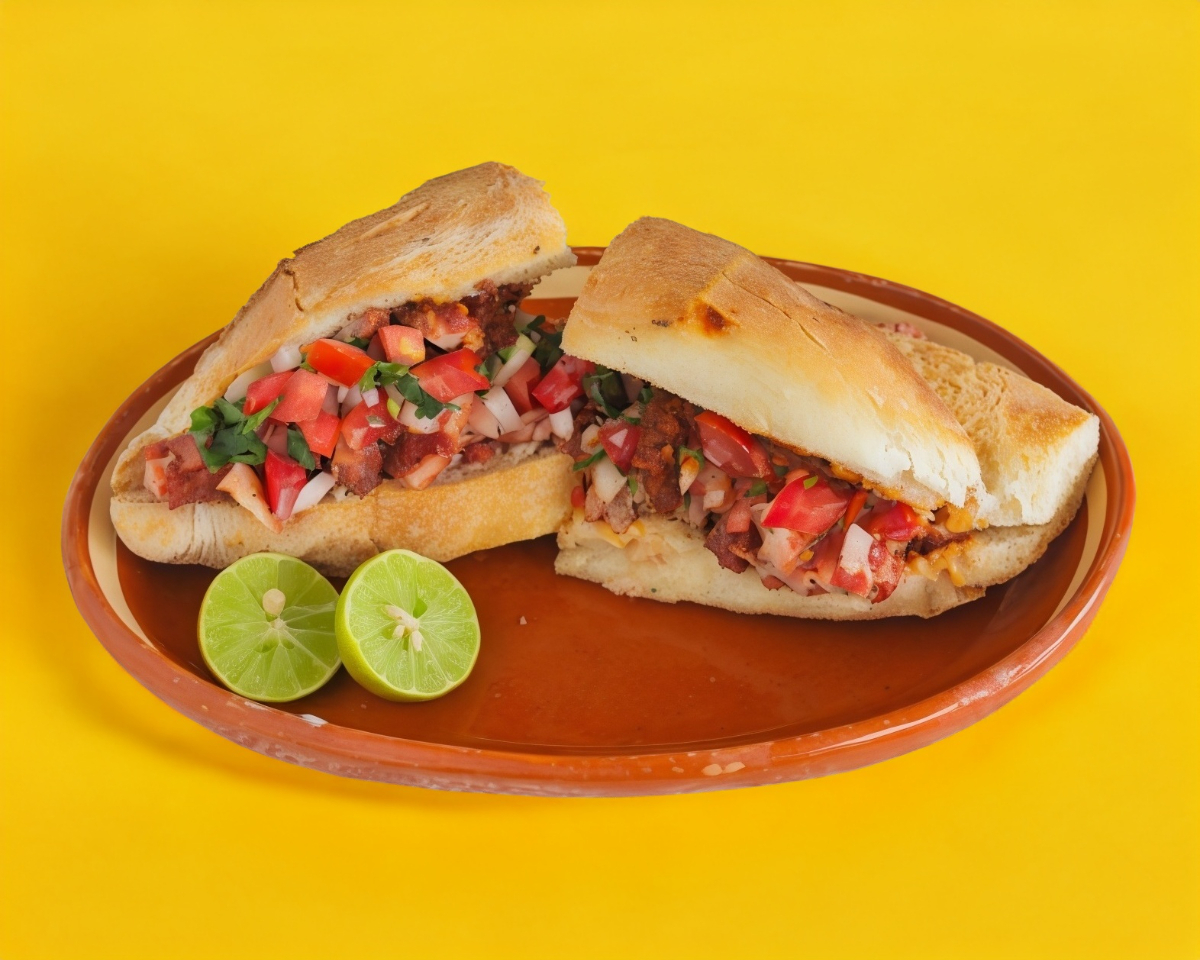 Bolillo fleima bien doradito ,con frijoles fritos ,carnitas mas salsa mexicana y chile