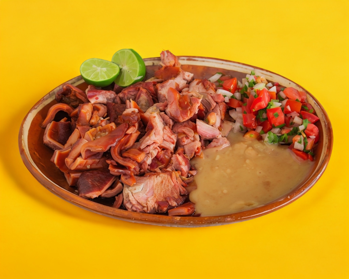 1 kg de carnitas, surtidas ,buche,cuero y mazisa más salsa mexicana y chile de molcajete y limones