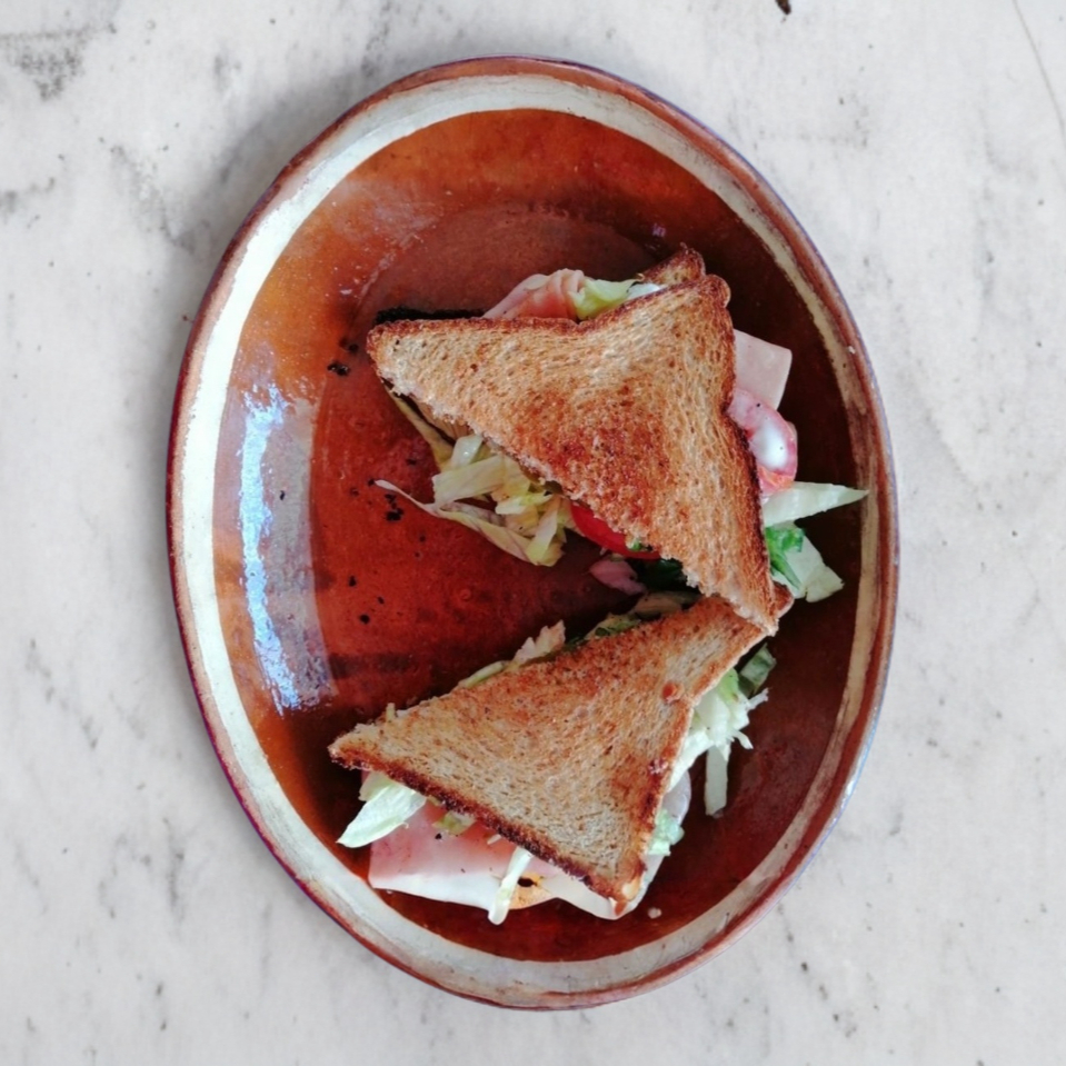 Pan integral con jamón ala plancha,(lechuga,jitomate,cebolla y chile ) catsup y mostaza