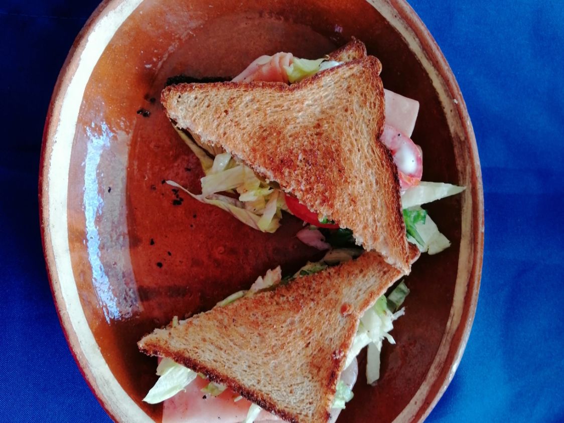 Pan integral con panela, con lechuga ,jitomate,cebolla y chile con catsup y mostaza