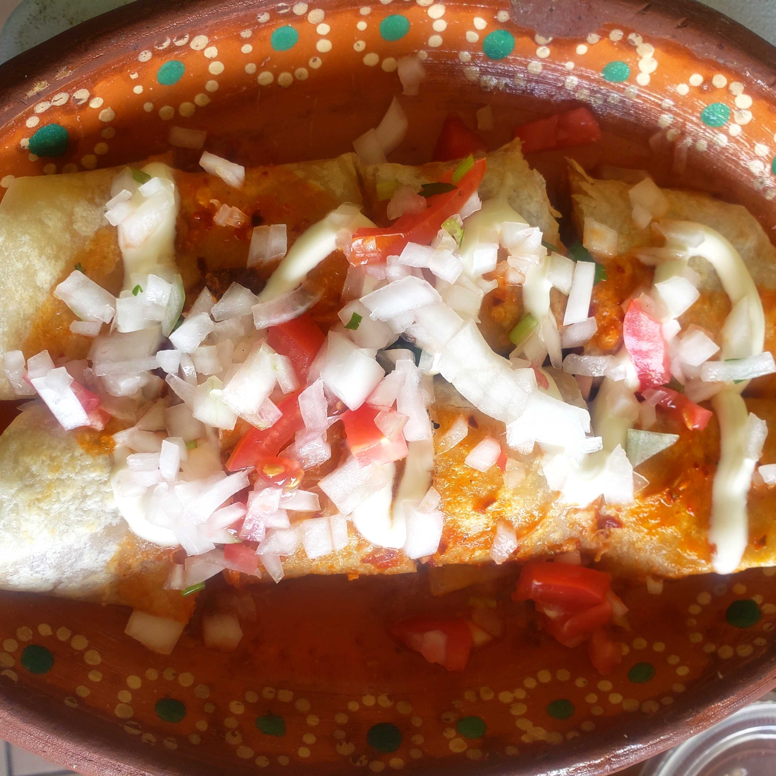 Orden de 3 Burritas ,con tortilla de harina grande, embarrada con frijoles fritos en manteca ,dentro deliciosa pierna adobada ,encima le ponemos jitomate, cebolla finamente picada,crema y consomé de la misma pierna