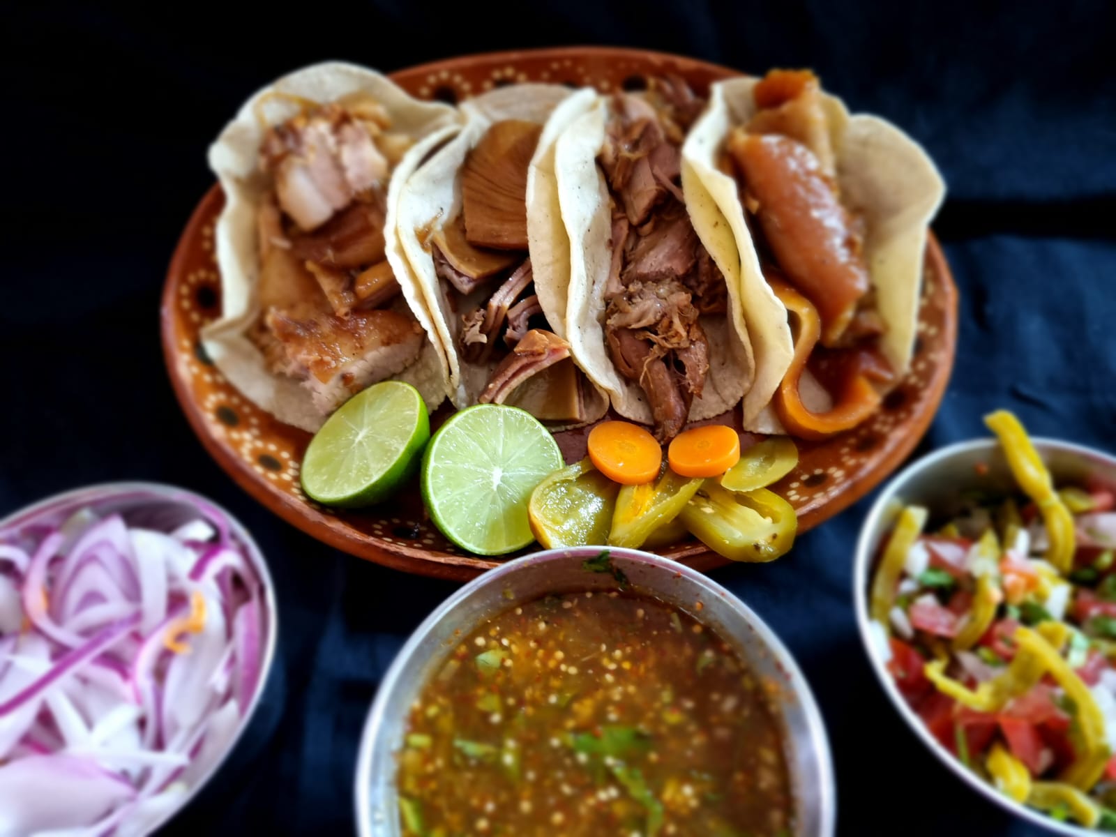 Deliciosa orden de carnitas, acompñada de verduras, salsas y tortillas.