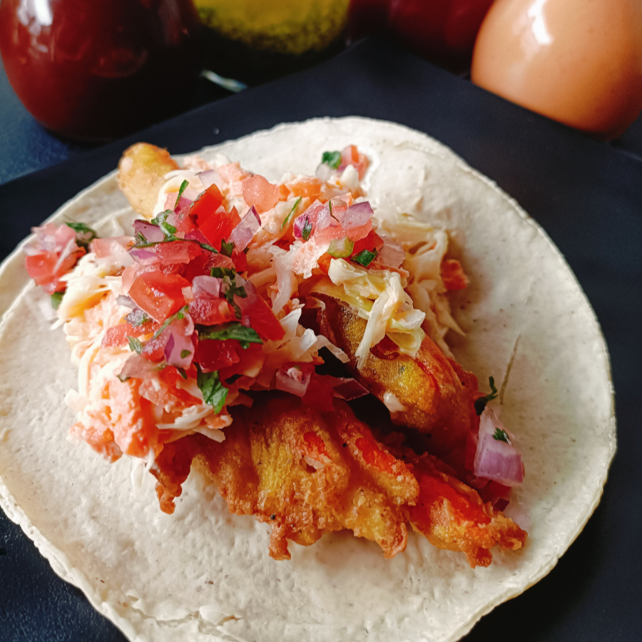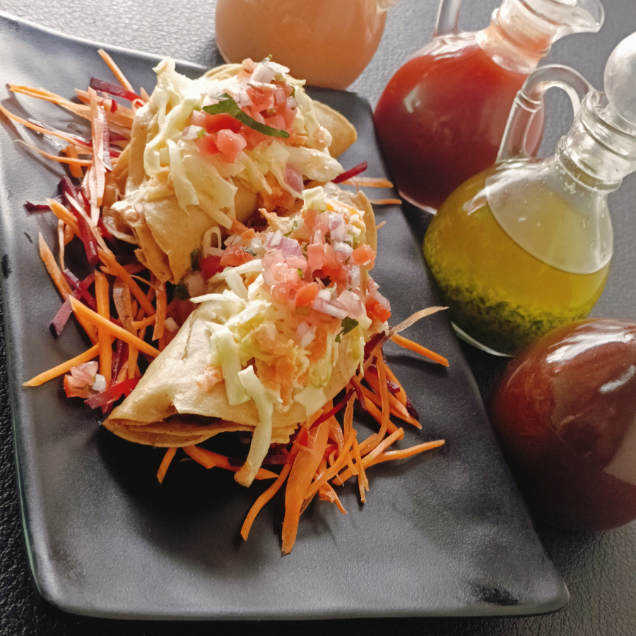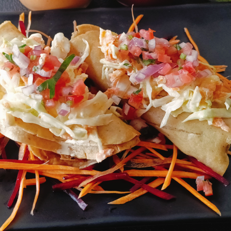 Tacos de camaron capeados estilo la paz acompañados de cremoso con col y zanahoria ,aderesos de chipotle y tamarindo