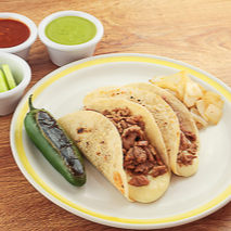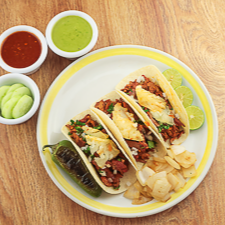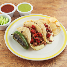Combo de 3 tacos a elegir (asada, combinado, pastor, chorizo), una bebida a elegir (agua fresca o refresco), un consomé.