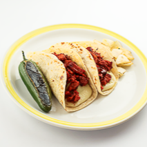 Barbacoa de res, tortilla de maíz, queso gratinado.