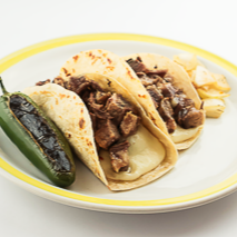 Labio de res, rebanado, tortilla de harina, con queso fundido.