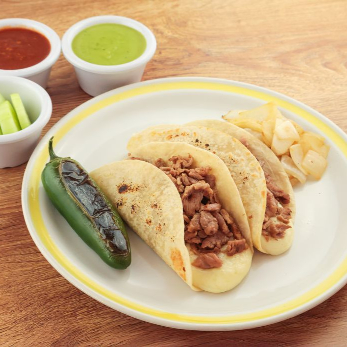 Labio de res, rebanado, tortilla de harina, con queso fundido.