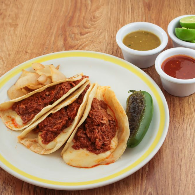 Barbacoa de res, tortilla de maíz, queso gratinado.