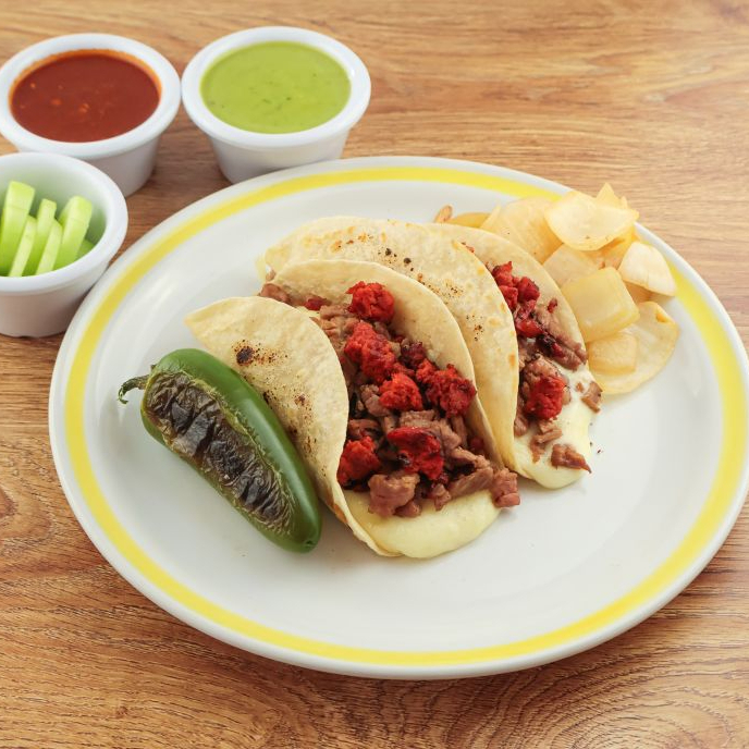 Porción de carne de res y porción de chorizo, tortilla de harina con queso fundido.