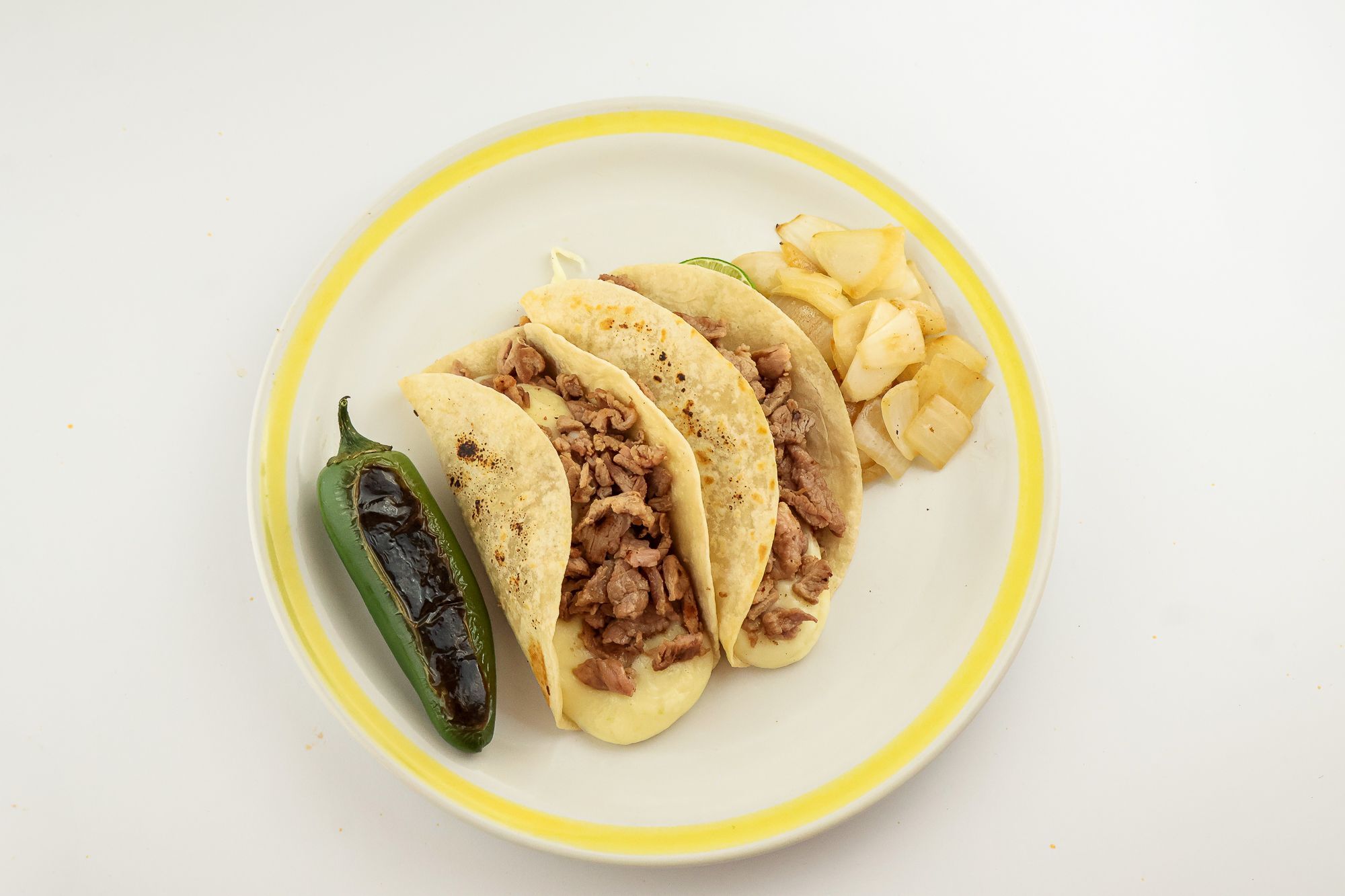 Porción de carne de res y porción de chorizo, tortilla de harina con queso fundido.