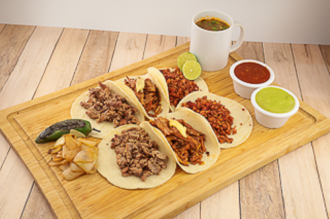 Combo de 3 tacos a elegir (asada, combinado, pastor, chorizo), una bebida a elegir (agua fresca o refresco), un consomé.
