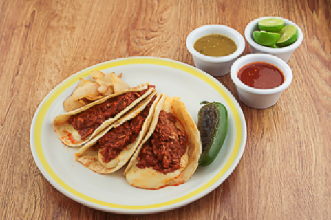 Combo de 4 tacos de barbacoa, una bebida a elegir (agua fresca o refresco), un postre, un consomé.