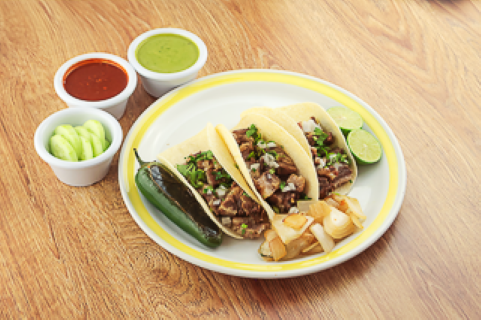 Combo de 3 tacos a elegir (asada, combinado, pastor, chorizo, barbacoa), una bebida a elegir (agua fresca o refresco), un consomé.
