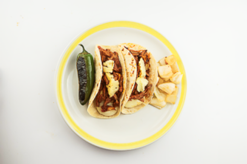 Barbacoa de res, tortilla de maíz, queso gratinado.
