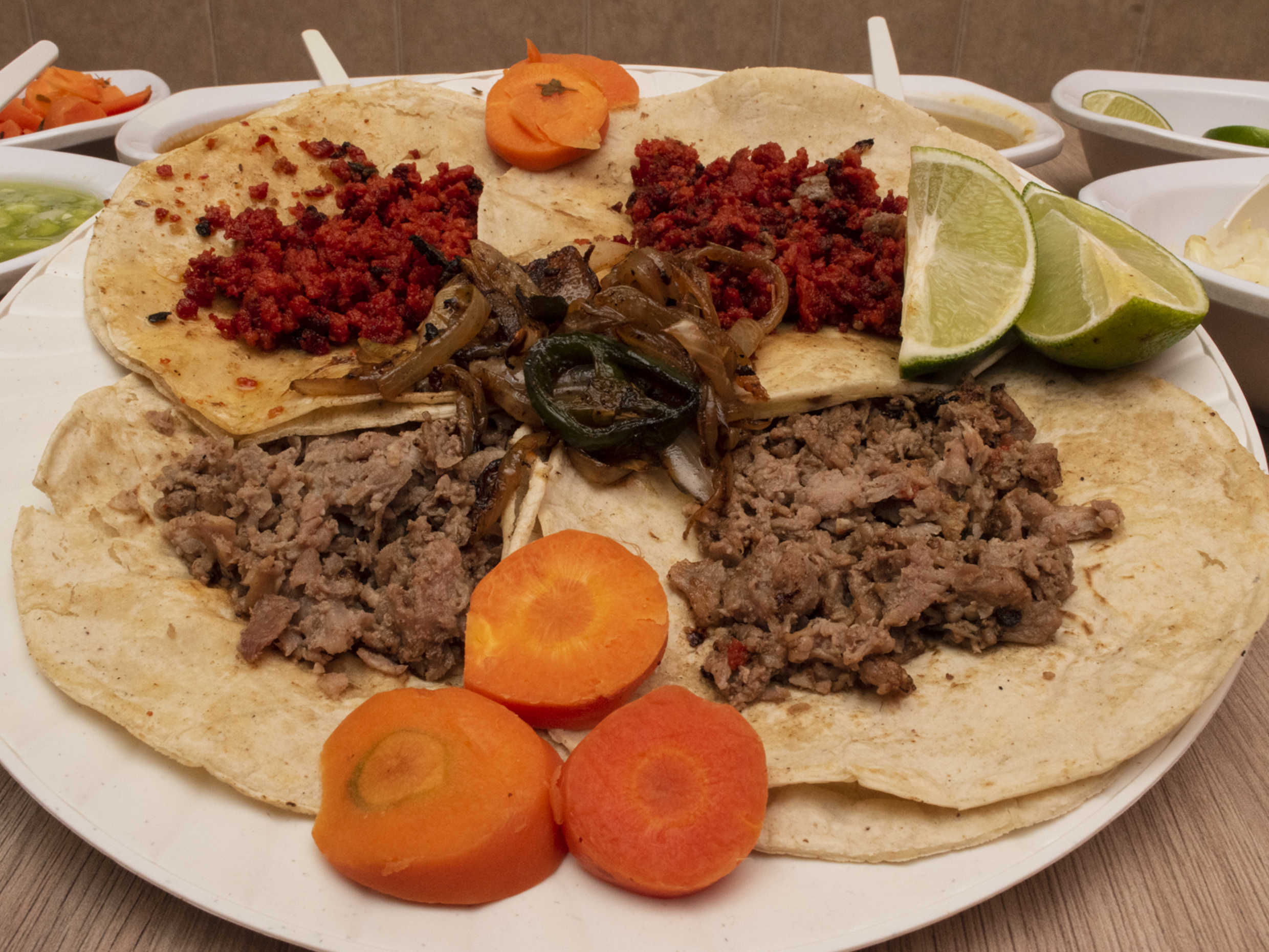 Tortilla maíz ,cebolla aparte ,Salsa de tomate roja ,salsa verde