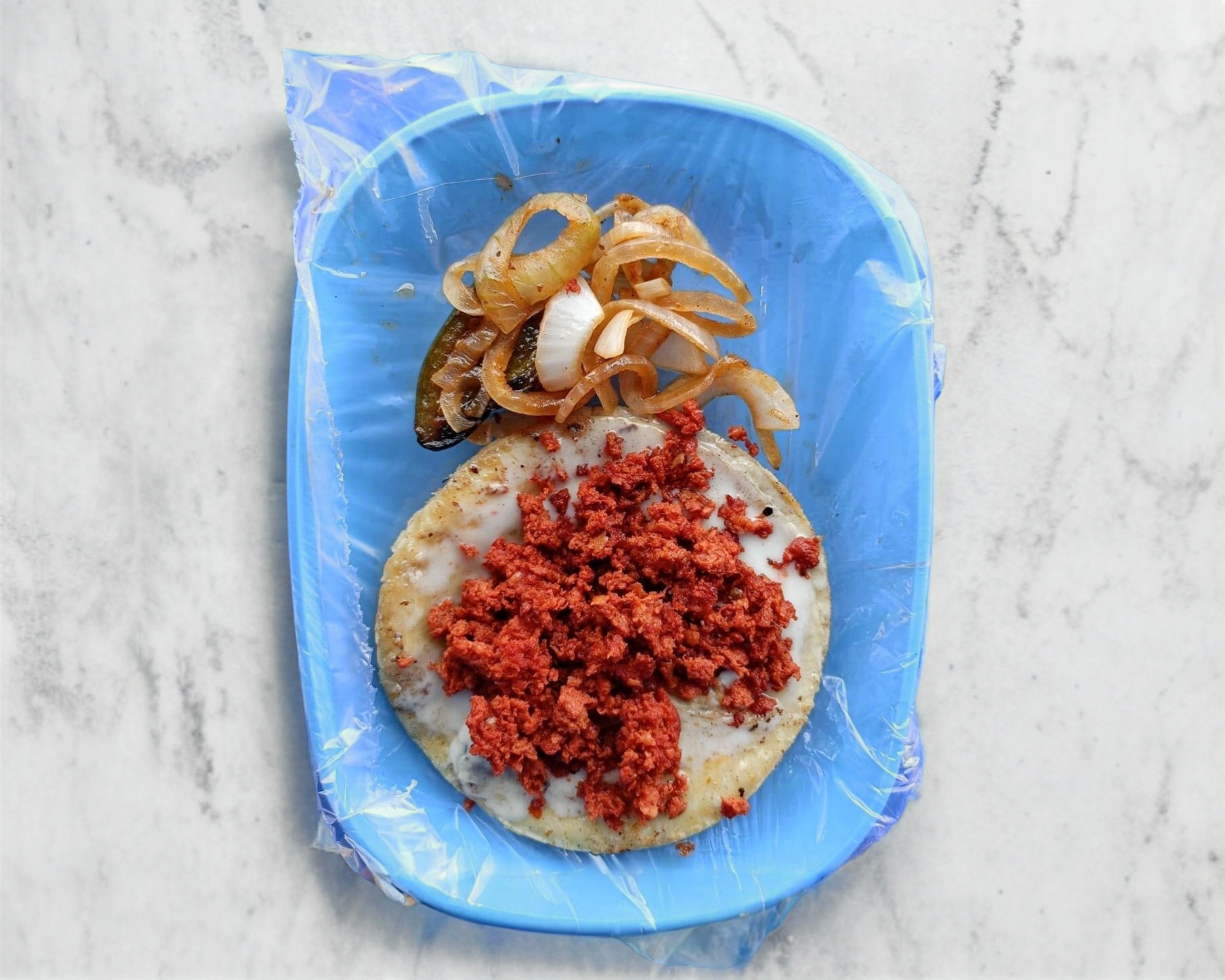 Taco de chorizo acompañado de cebolla, cilantro y salsa picante