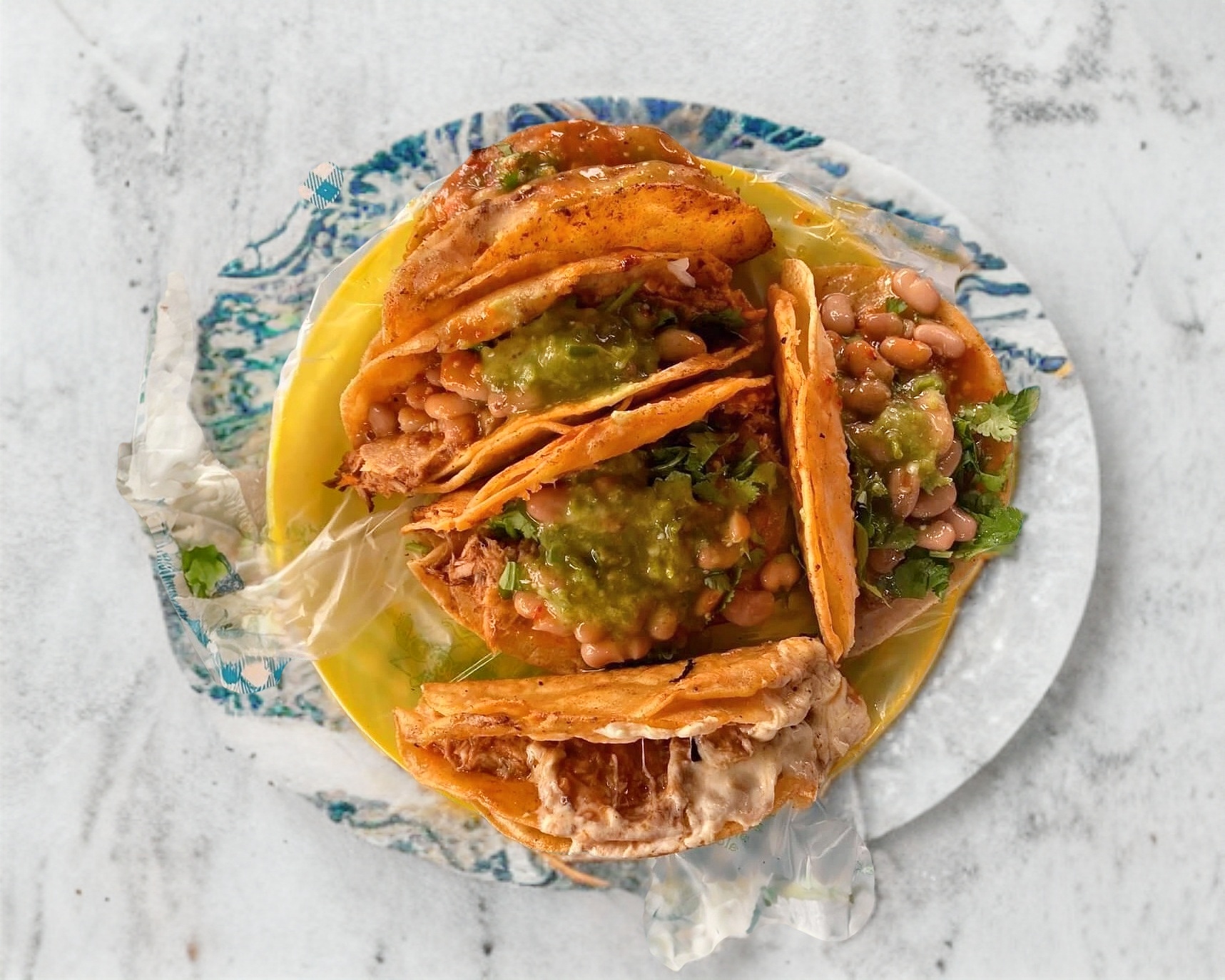 Taco de chorizo con queso adobera gratinado acompañado de cebolla, cilantro y salsa picante