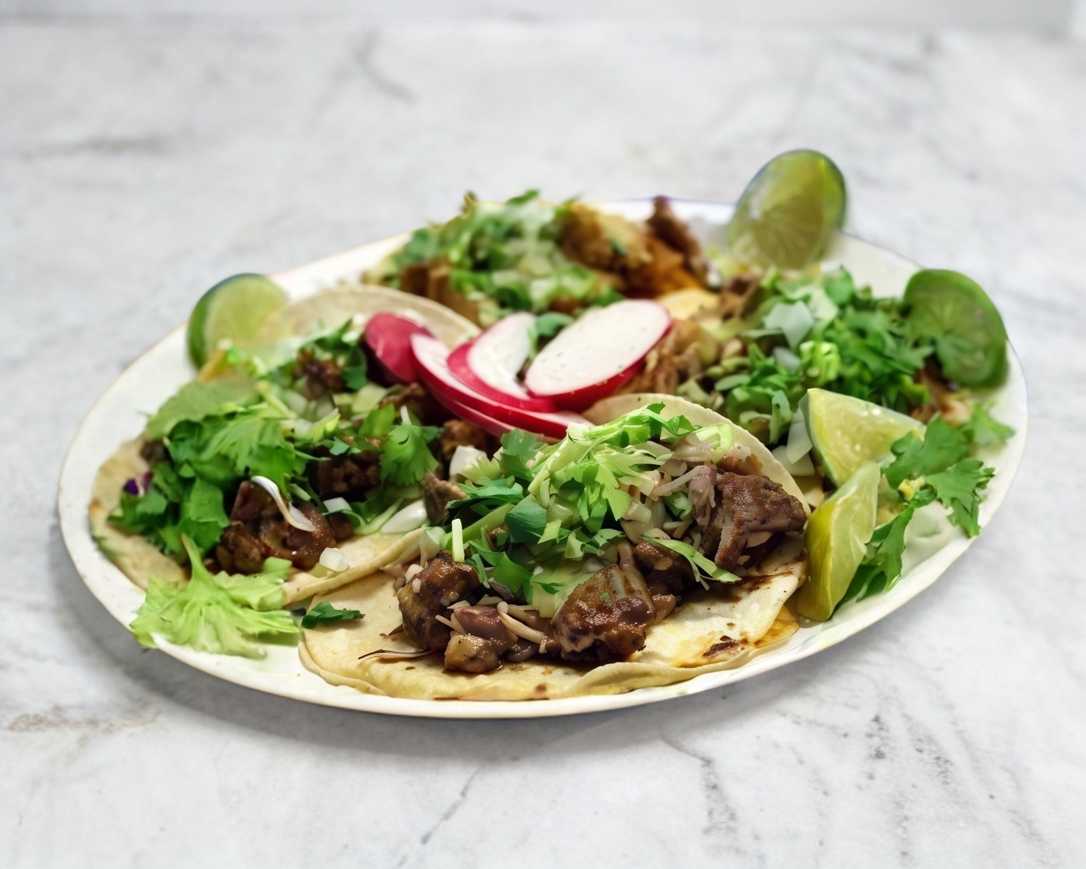 Taco de chicarrón prensado porción mediana acompañado de cebolla, cilantro, limón y salsa picante.