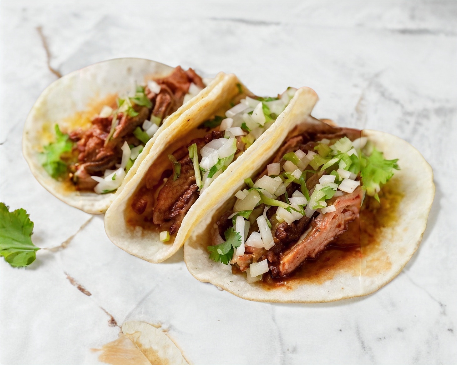 Taco de birria de carne de res acompañado de cebolla, cilantro y salsa picante