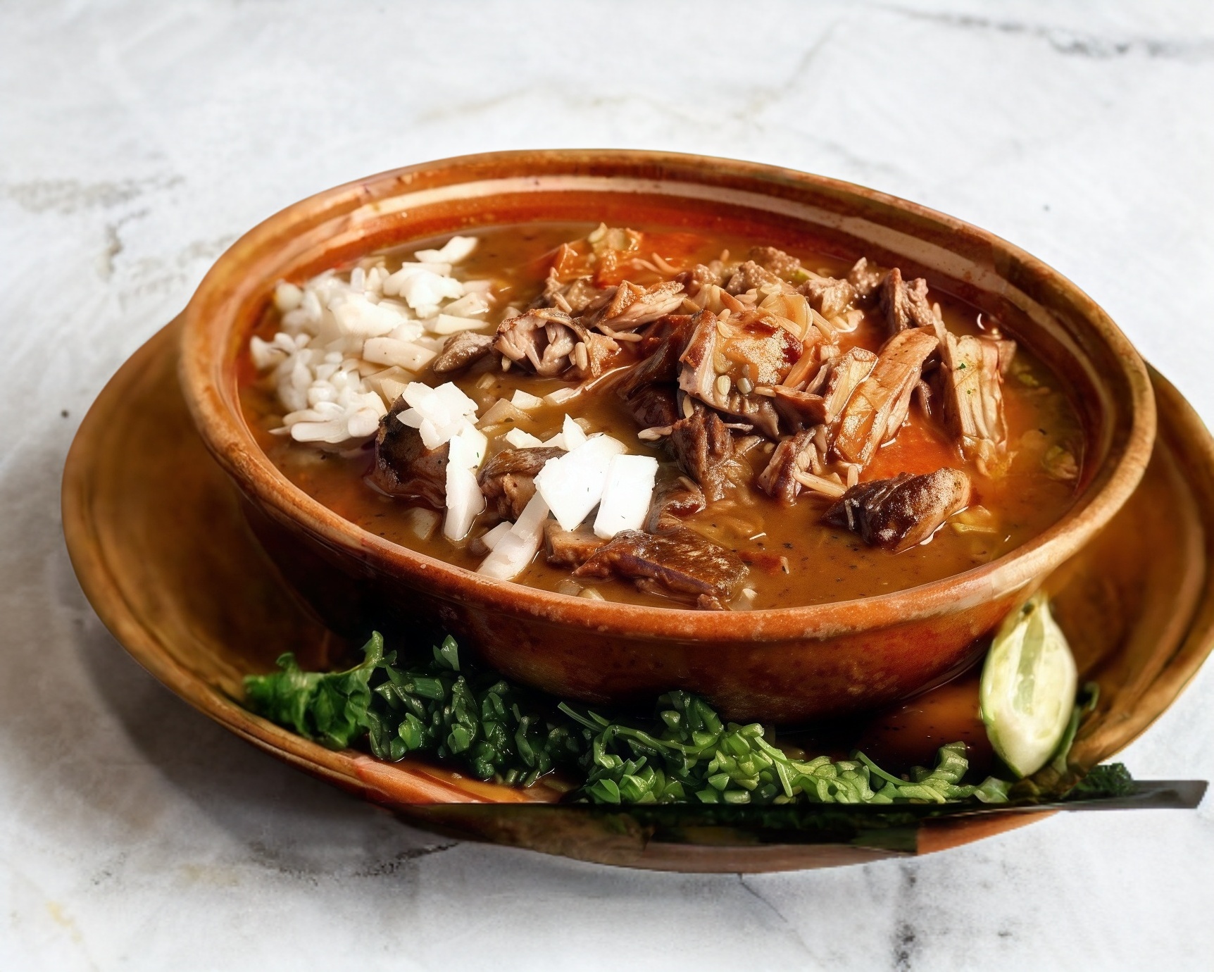 Orden de birria de carne de res acompañado de cebolla, cilantro y sal picante para una o dos personas