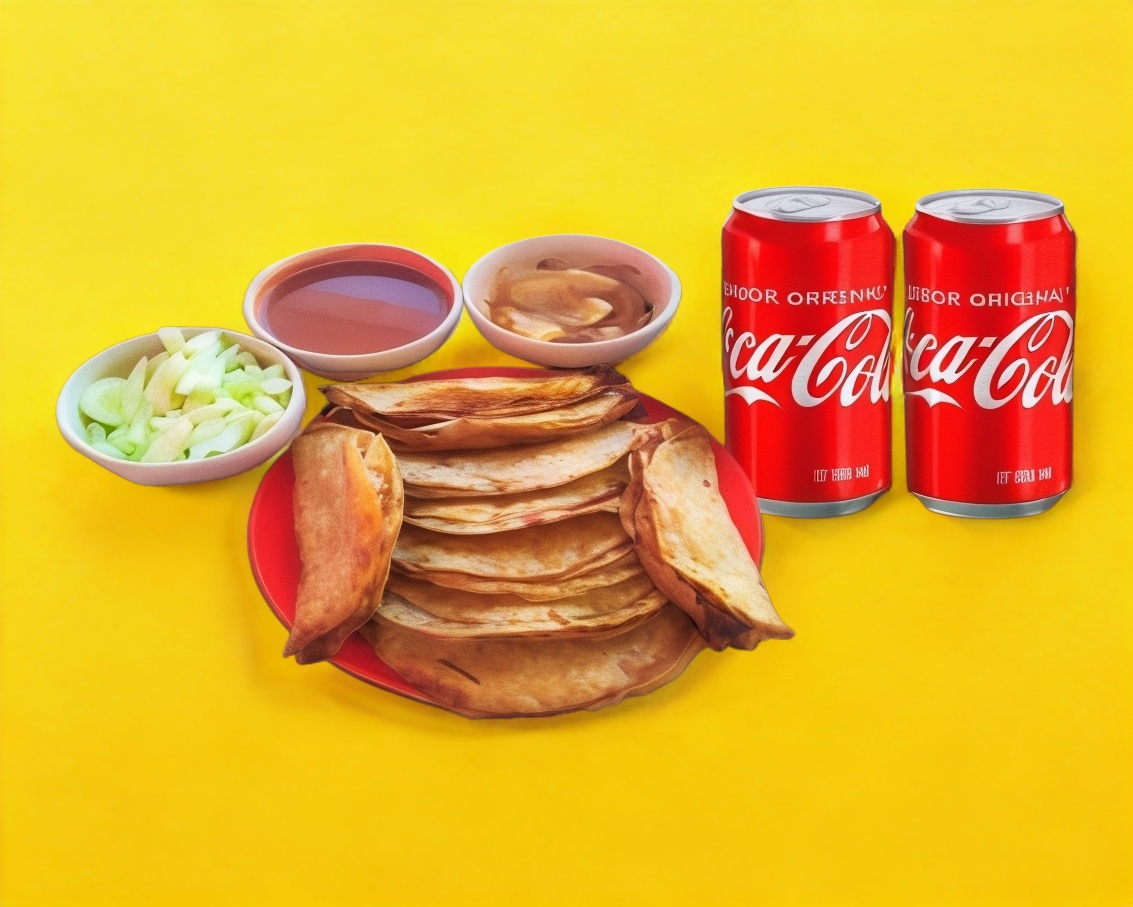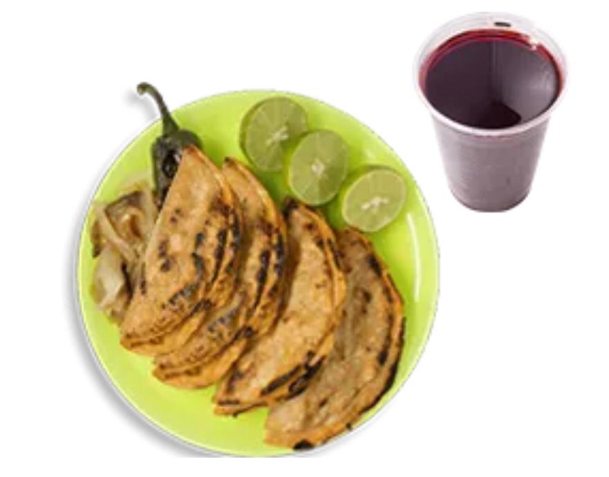 4 tacos con Guarniciones, Cebolla guisada, salsa roja, salsa verde, pepino, cebolla, picada y limones + Bebida refresco o agua del día 400ml sujeto a disponibilidad.