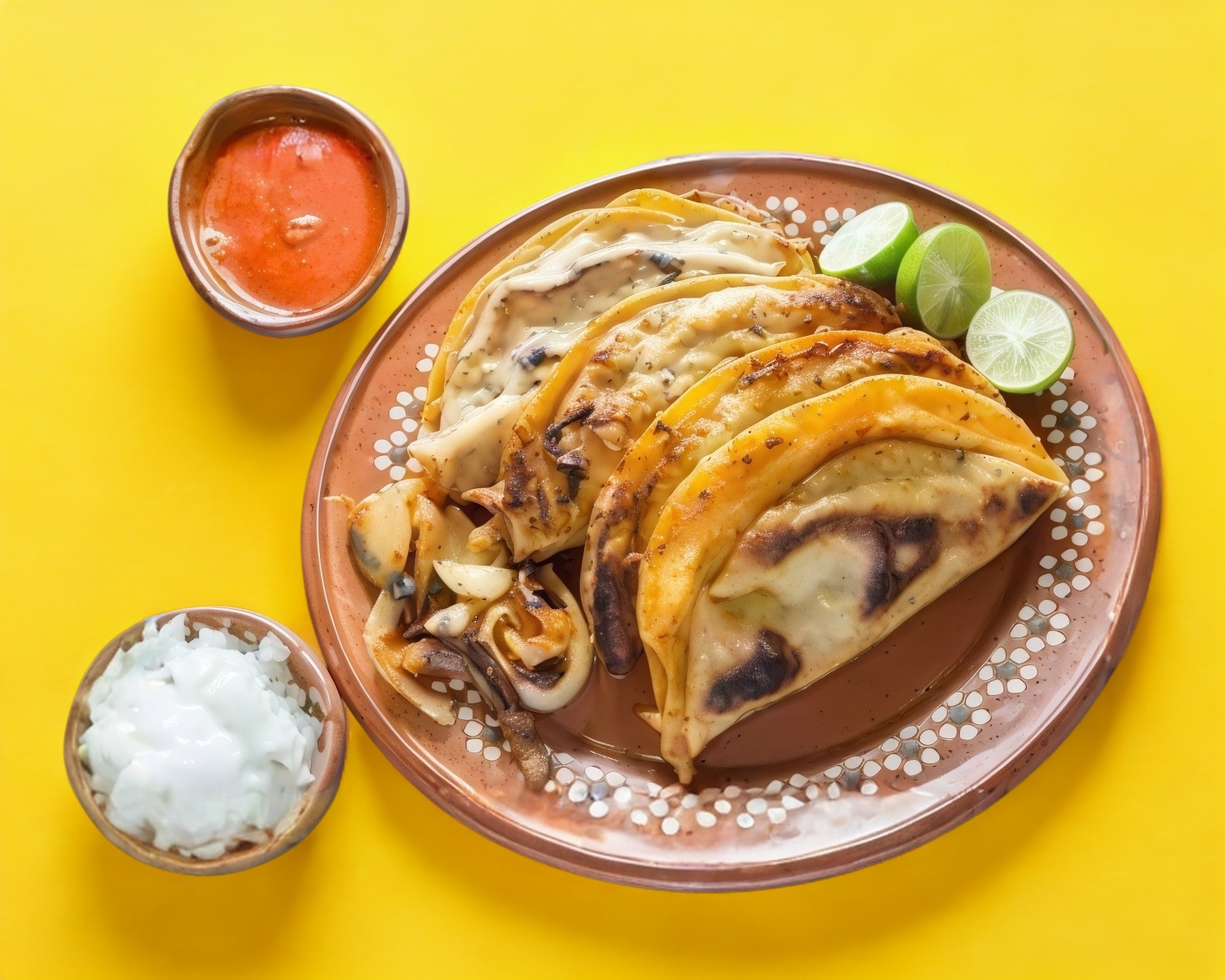 Acompañados de cebolla guisada, salsa roja, salsa verde, pepino, cebolla picada y limones