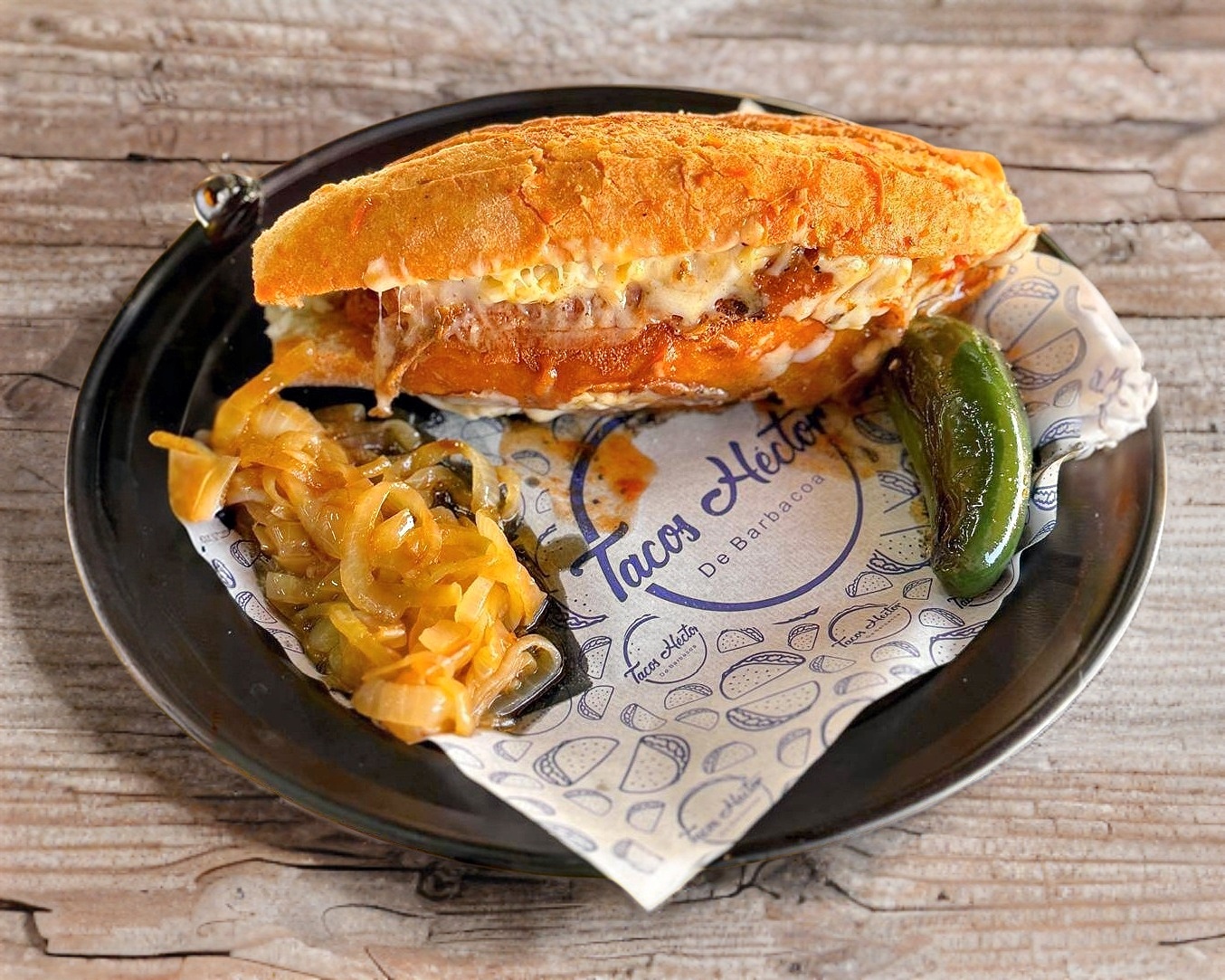 Lonche de barbacoa con queso gratinado estilo Jalisco.