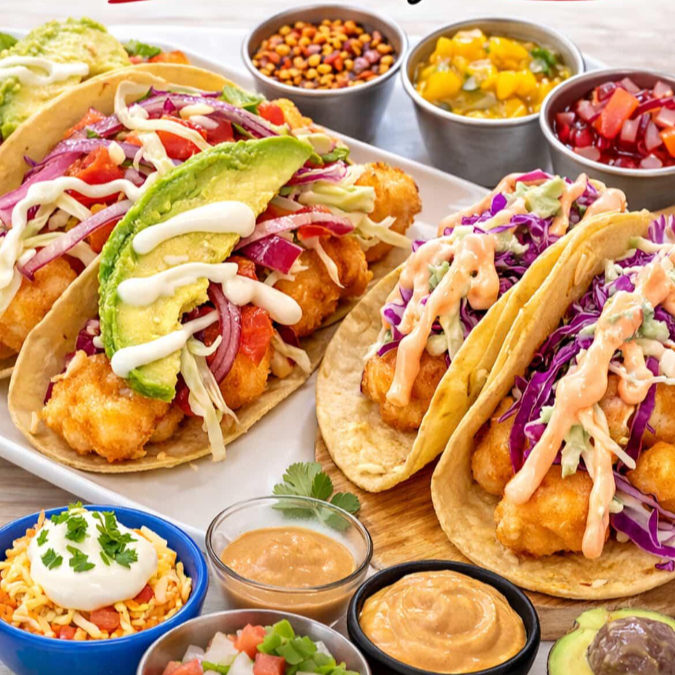 Pescado crujiente preparado al momento. Se sirve con col fresca, zanahoria y mayonesa. Incluye salsas de la casa: salsa a la mexicana, salsa negra con cebolla morada, habanero y mango (en temporada), mayonesa con chipotle y salsa de cacahuate.