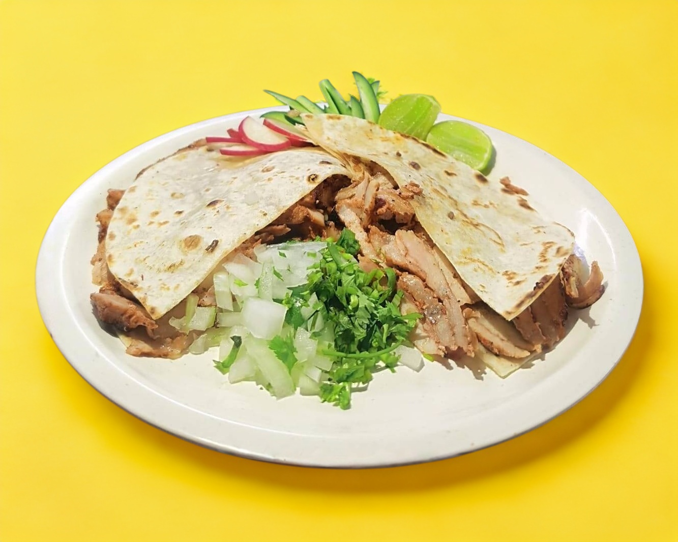 2 Tortillas de harina con porción de queso con la carne de su elección acompañada de salsas.